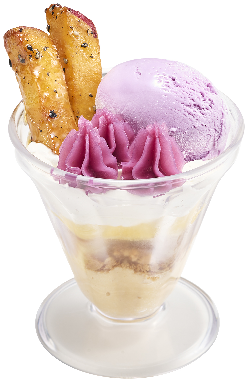 “いも”を使用したアイスに、紫芋などを使用したいも餡と大学いもを添えた、とことん“いも”を堪能できるパフェ。