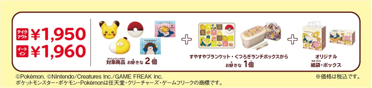 セット内容:ミスド ポケモン ドーナツ(好きな2個)、すやすやブランケット・くつろぎランチボックスから好きな1個、オリジナル紙袋・ボックス