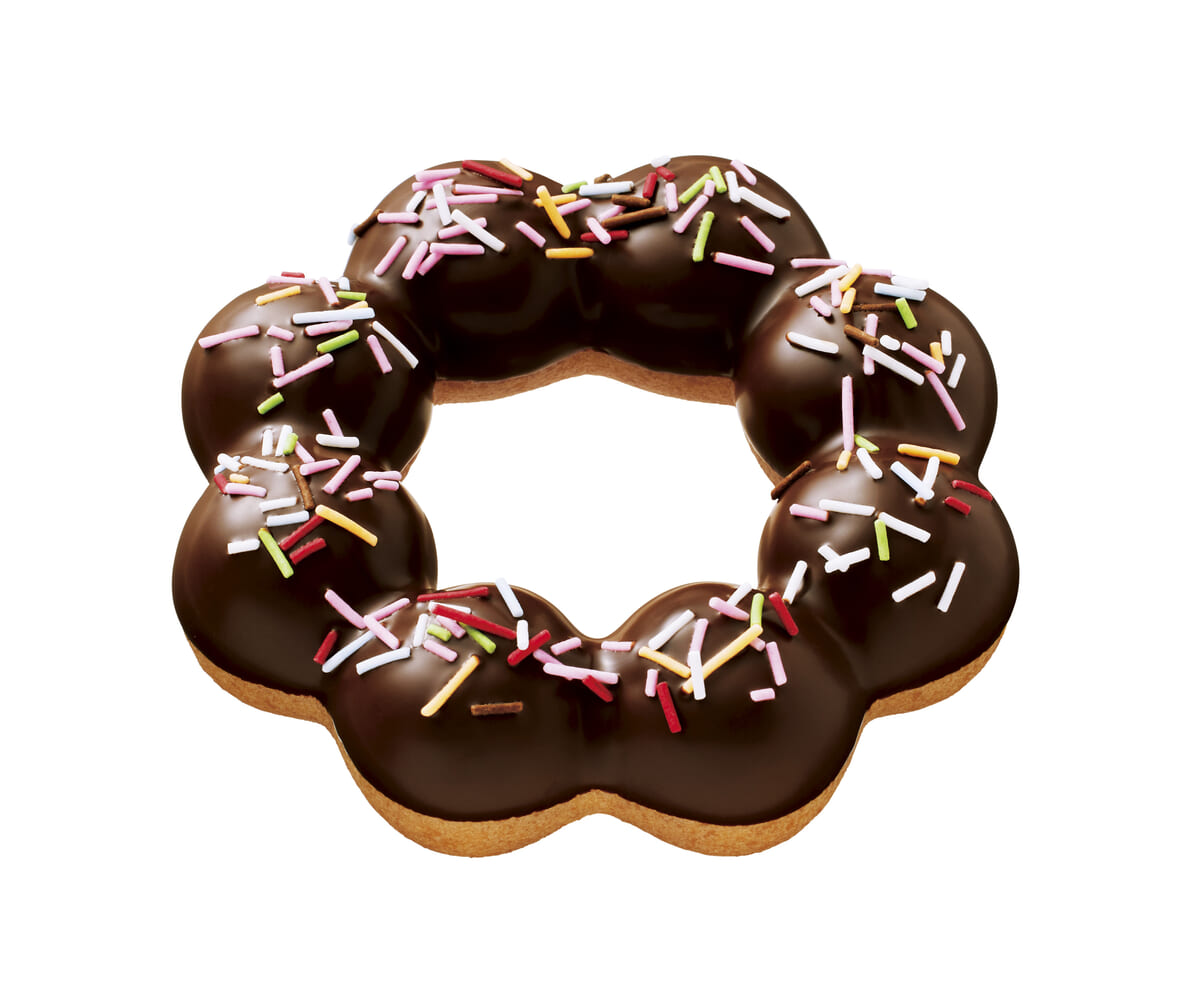 ポン・デ・リング生地をチョコレートでコーティングし、カラーシュガーをトッピング。