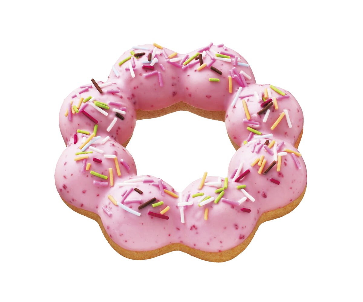 ポン・デ・リング生地をストロベリーチョコでコーティングし、カラーシュガーをトッピング。