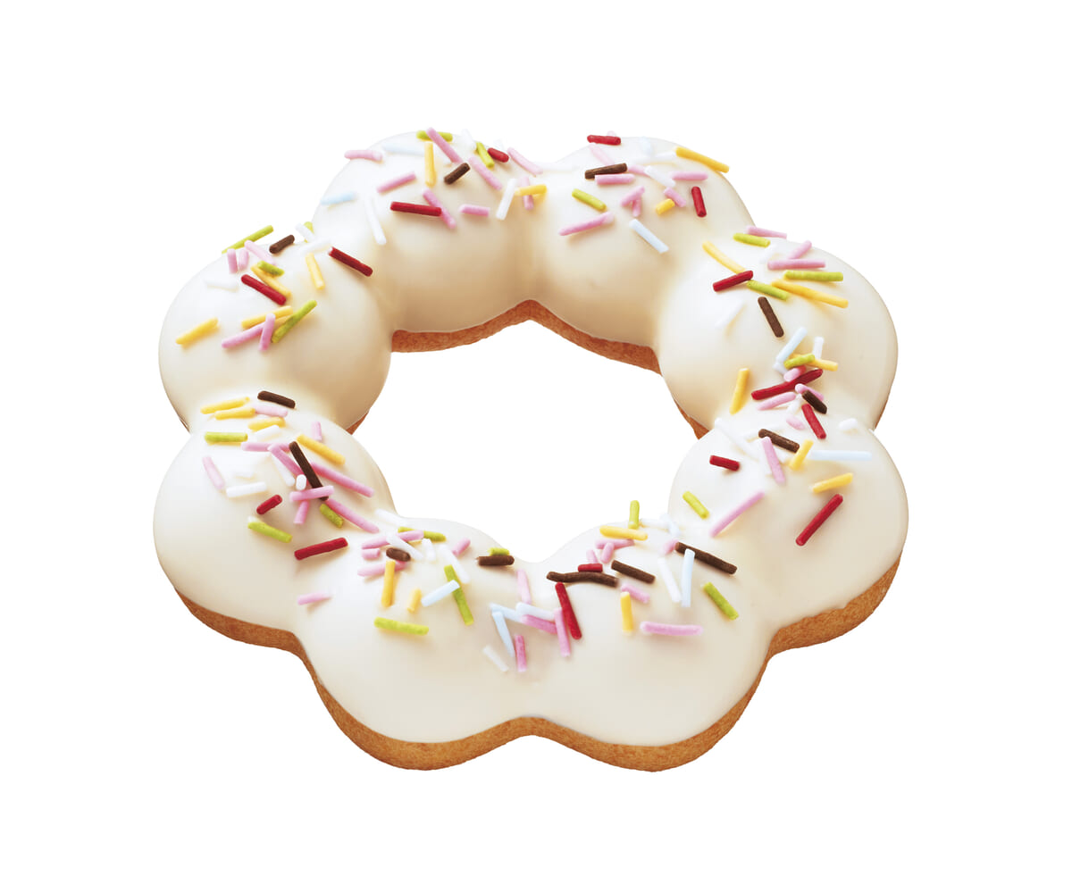 ポン・デ・リング生地をホワイトチョコでコーティングし、カラーシュガーをトッピング。