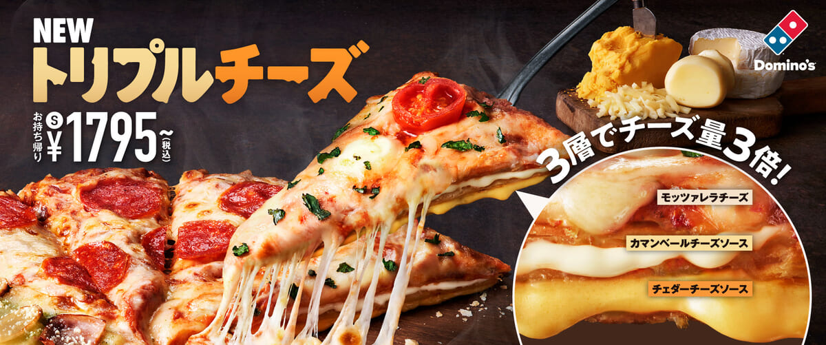 宅配ピザチェーン「ドミノ・ピザ」に、モッツァレラ&カマンベール&チェダーチーズを3層に、通常の3倍量使用した新たなオリジナルクラスト「トリプルチーズ」が期間限定で登場。