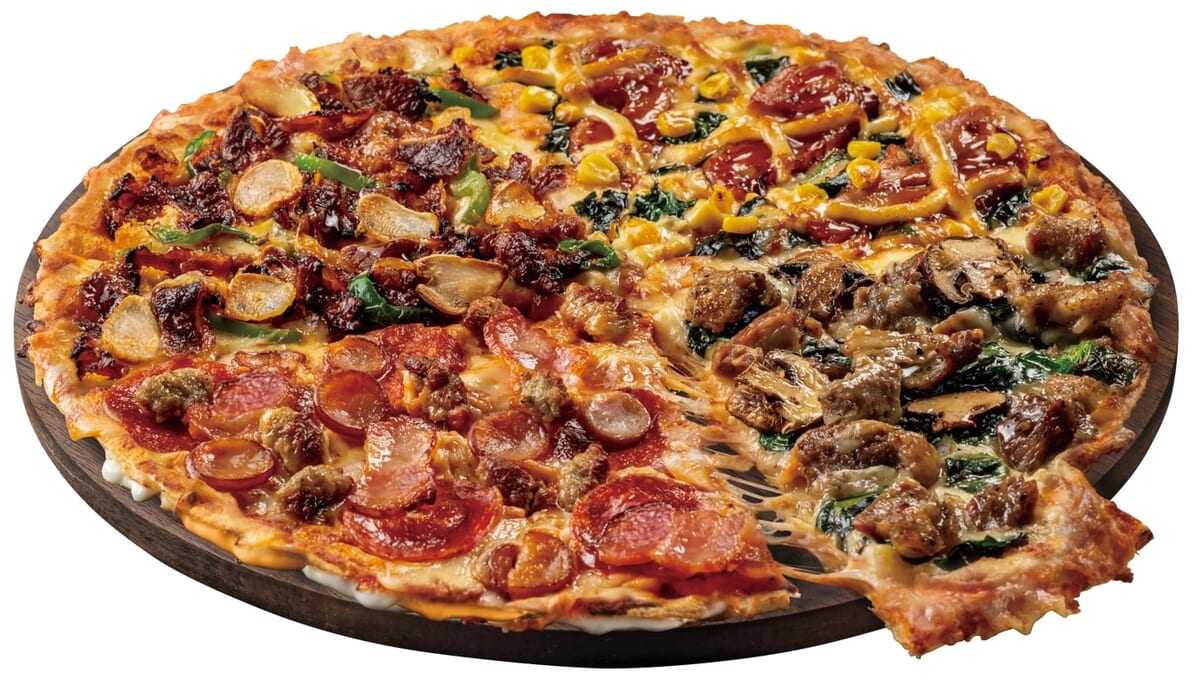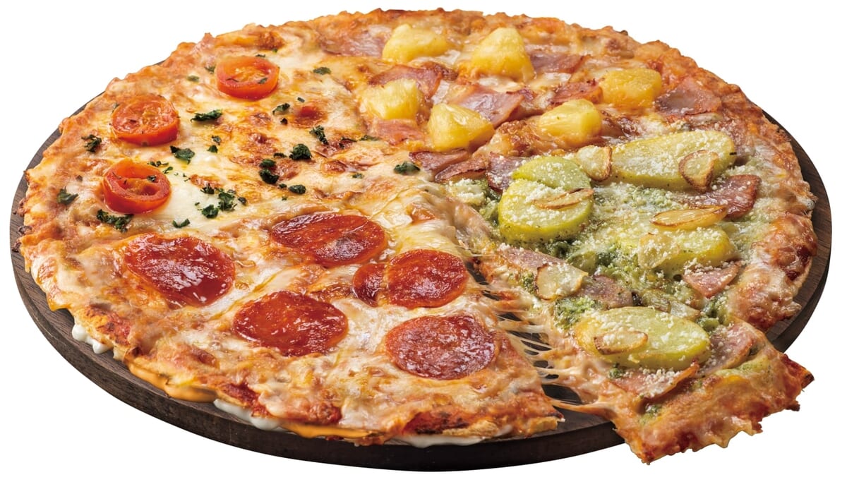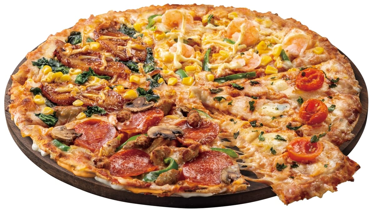 「マヨシュリンプ」「マルゲリータ」「ドミノ・デラックス」「炭火焼チキテリ」が一度に堪能できます。
