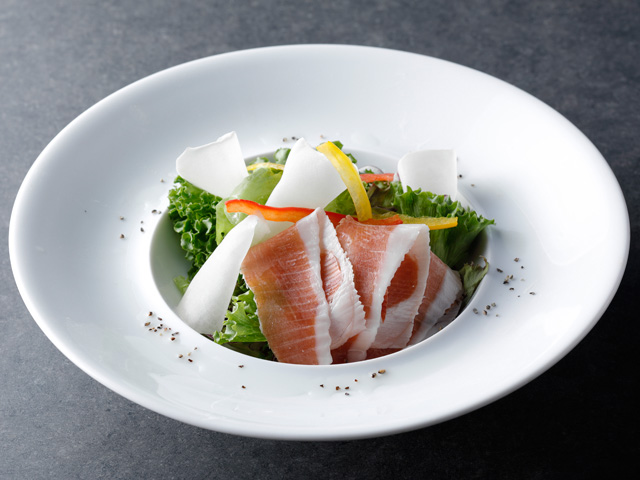 サラダの主役には“世界三大生ハム”の一つで旨みと肉の味わいを強く感じられるスペイン産の “ハモンセラーノ”が提供されます。