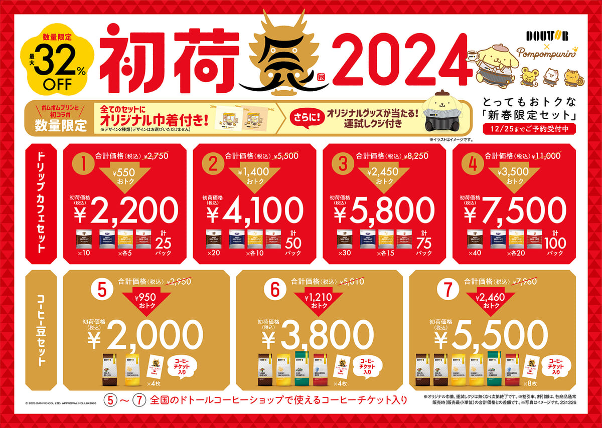 「ポムポムプリン」の限定デザイン巾着やオリジナルグッズが当たる運試しクジが付いた、ドトールコーヒーの新春限定セット「初荷2024」は、2023年12月26日(火)より販売開始、2023年11月8日(水)より順次店頭予約スタートです☆
