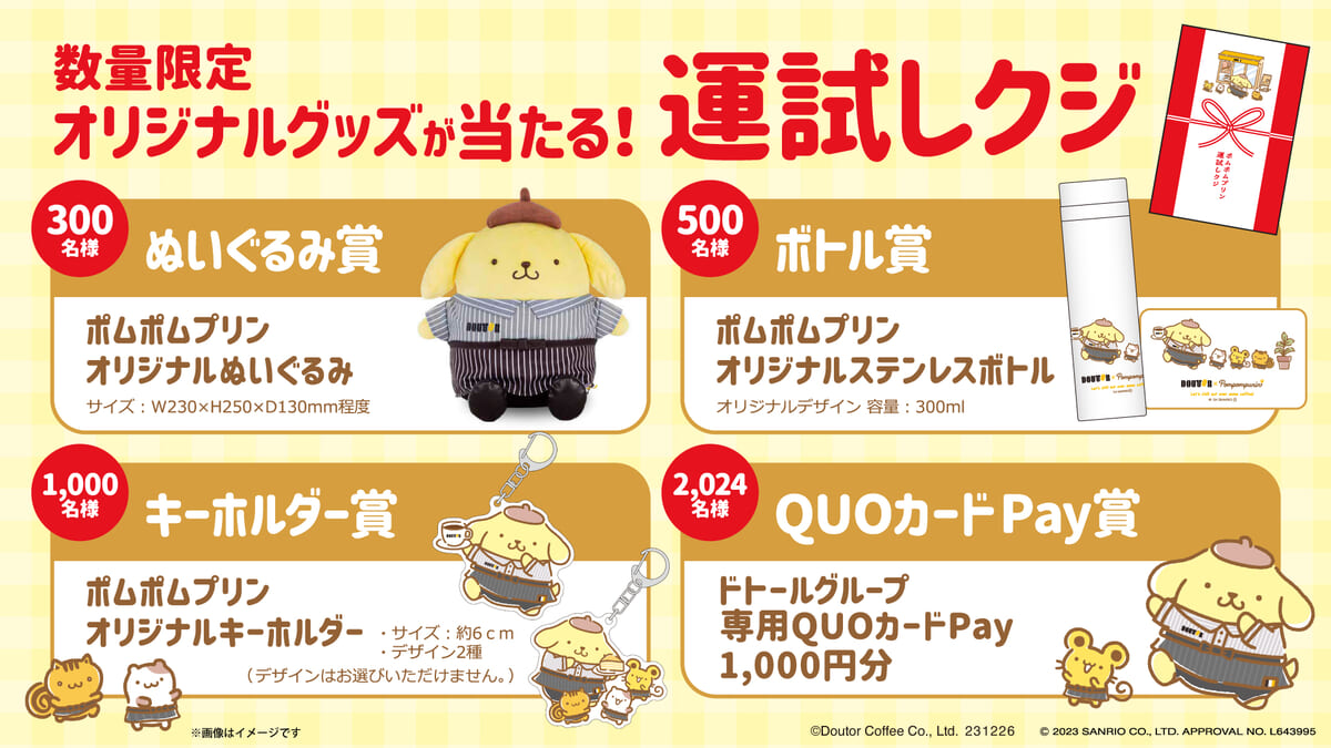 数量限定で、「DOUTOR×ポムポムプリン」のオリジナルデザインの巾着や「オリジナルグッズが当たる!運試しクジ」が付いてきます☆