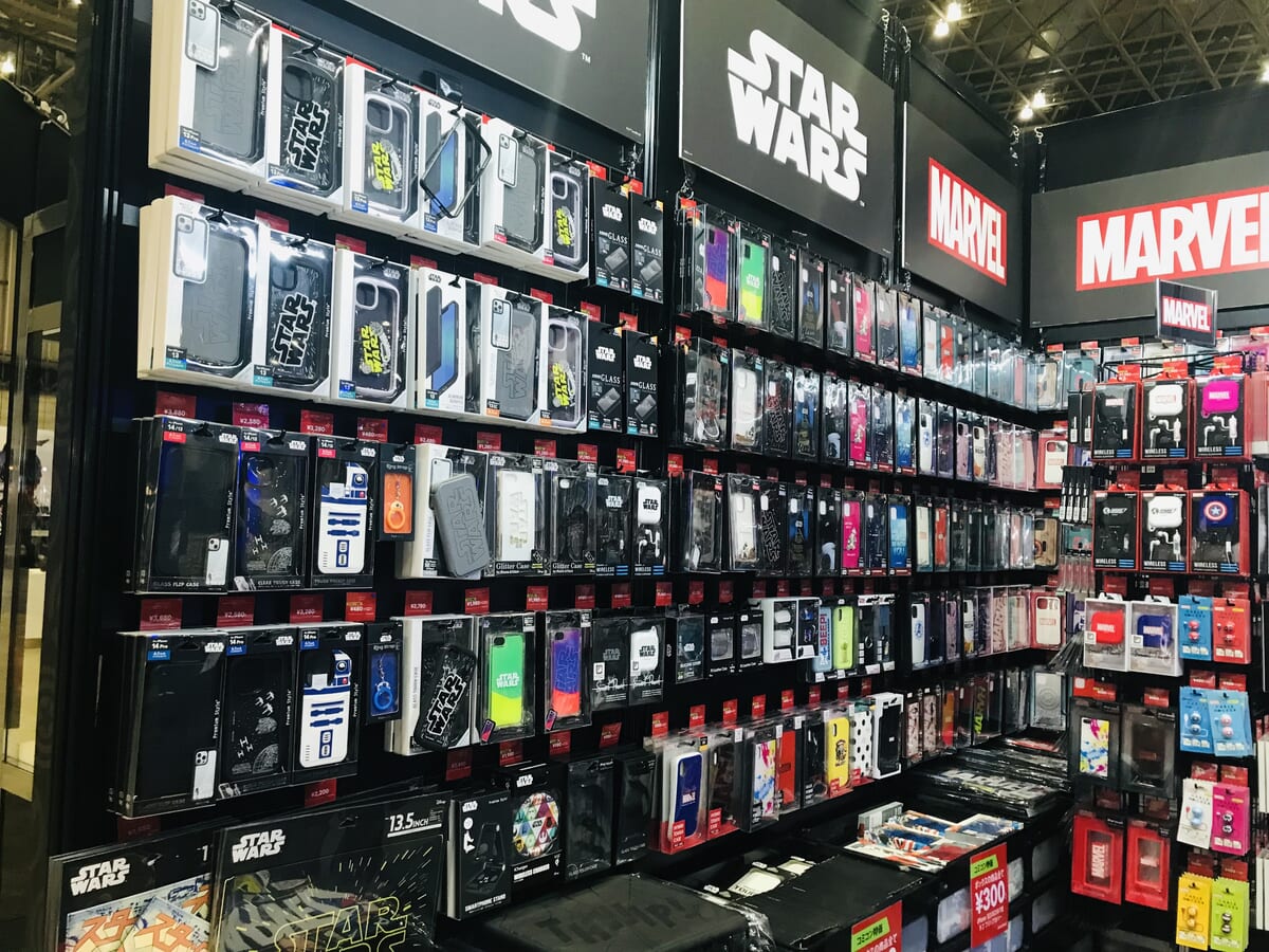 「マーベル」「スター・ウォーズ」のスマートフォンアクセサリーなどが並ぶ3日間限定のブース。