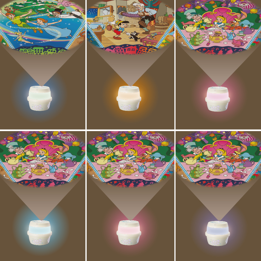 本体にディスクをセットするとゆっくりと動く映像が投影されるとともに音楽が流れリラックスタイムを演出し、寝かしつけをサポートします。