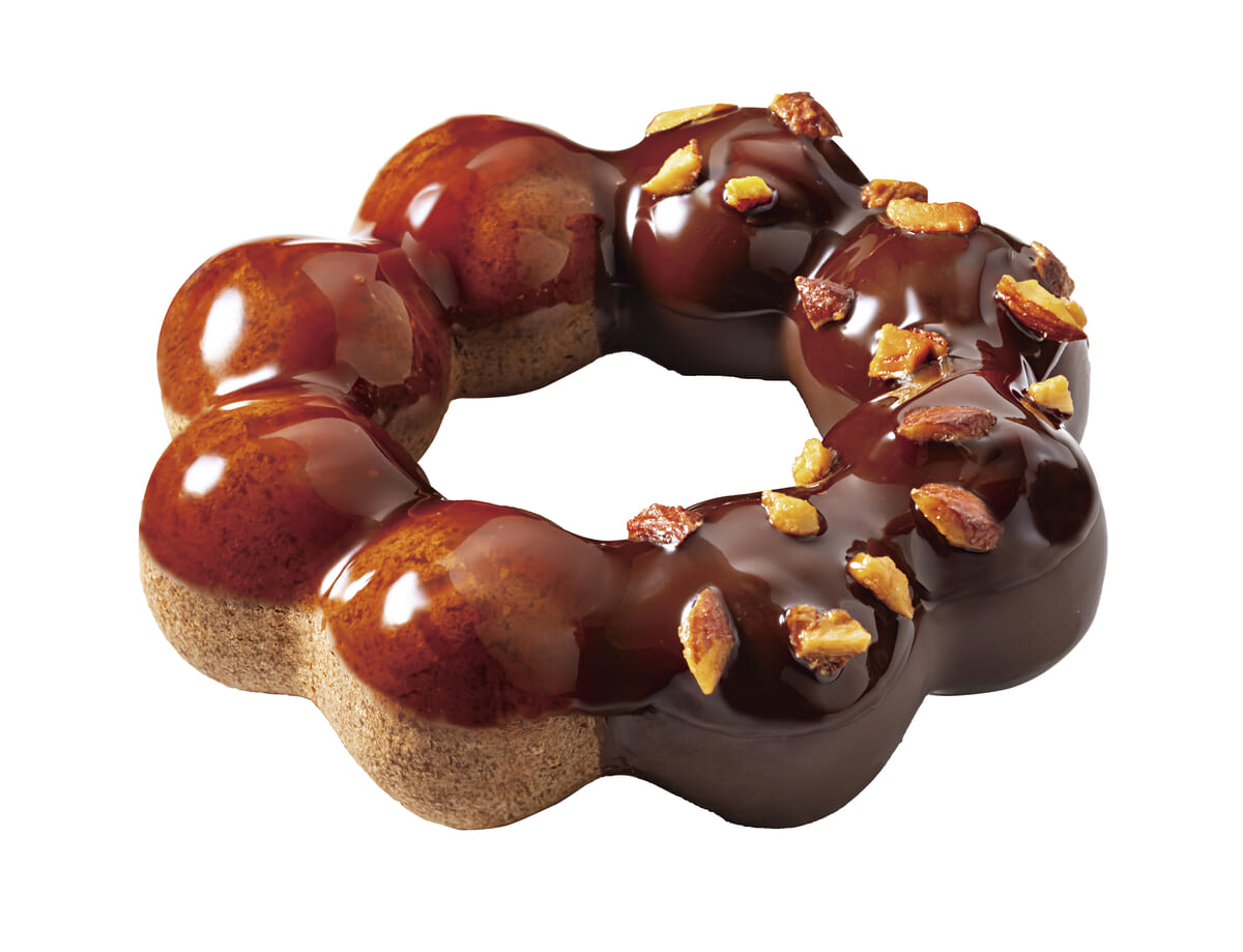 ヘーゼルナッツ風味が隠し味のショコラ生地に新しくバニラの香りを加えることでよりショコラを感じられ、さらに芳醇なカカオの香りやキャラメルの香りが楽しめるソースをトッピングしたドーナツです。