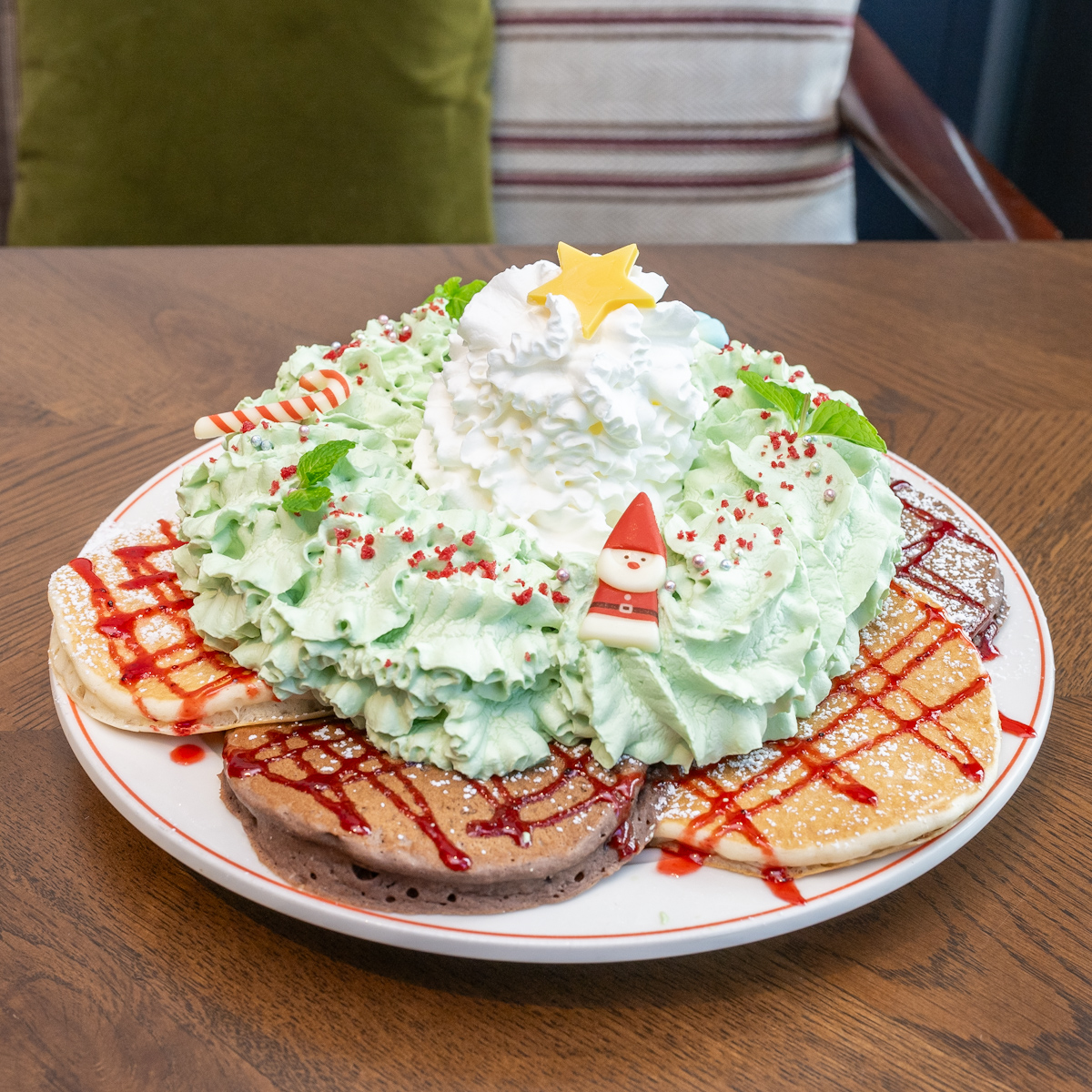 「クリスマスリースパンケーキ」は、クリスマスリースをイメージした、華やかな見た目の一品。