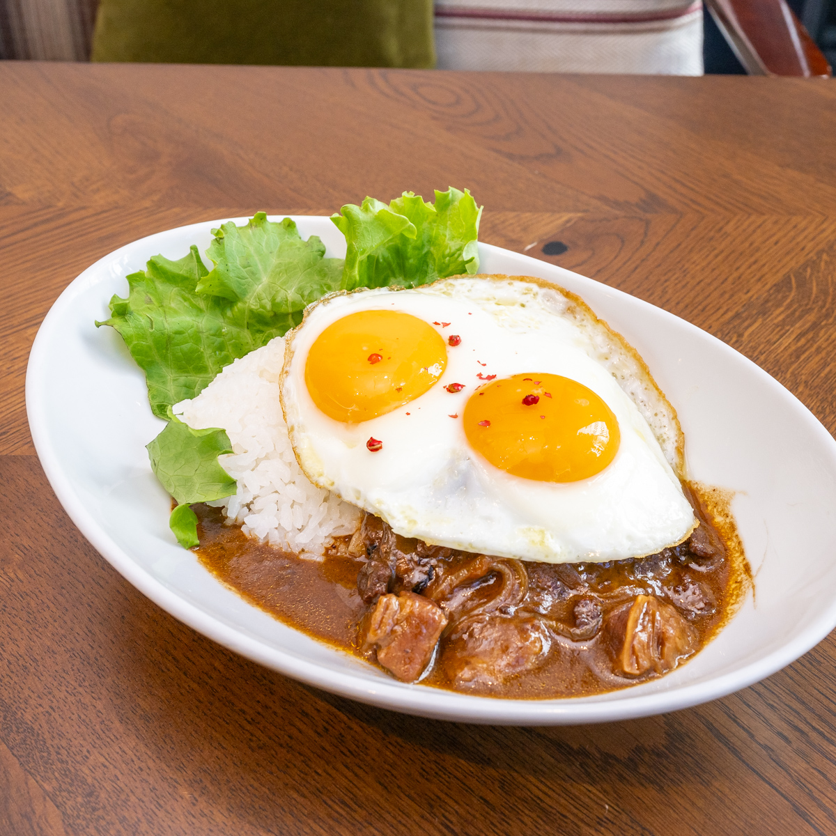 「ビーフシチュー ロコ・モコ」は、じっくり煮込んだシチューに、ごろっとした牛肉とビーフパティを使ったハワイのロコフード仕立ての一皿。
