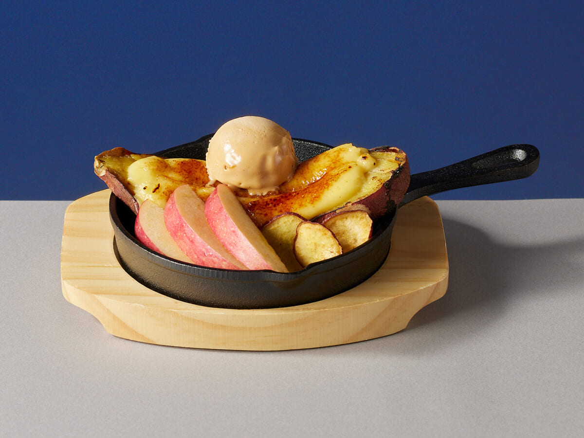 あたたかいスキレットで提供される、冬にぴったりの「焼きいものあったかカスタードブリュレ」
