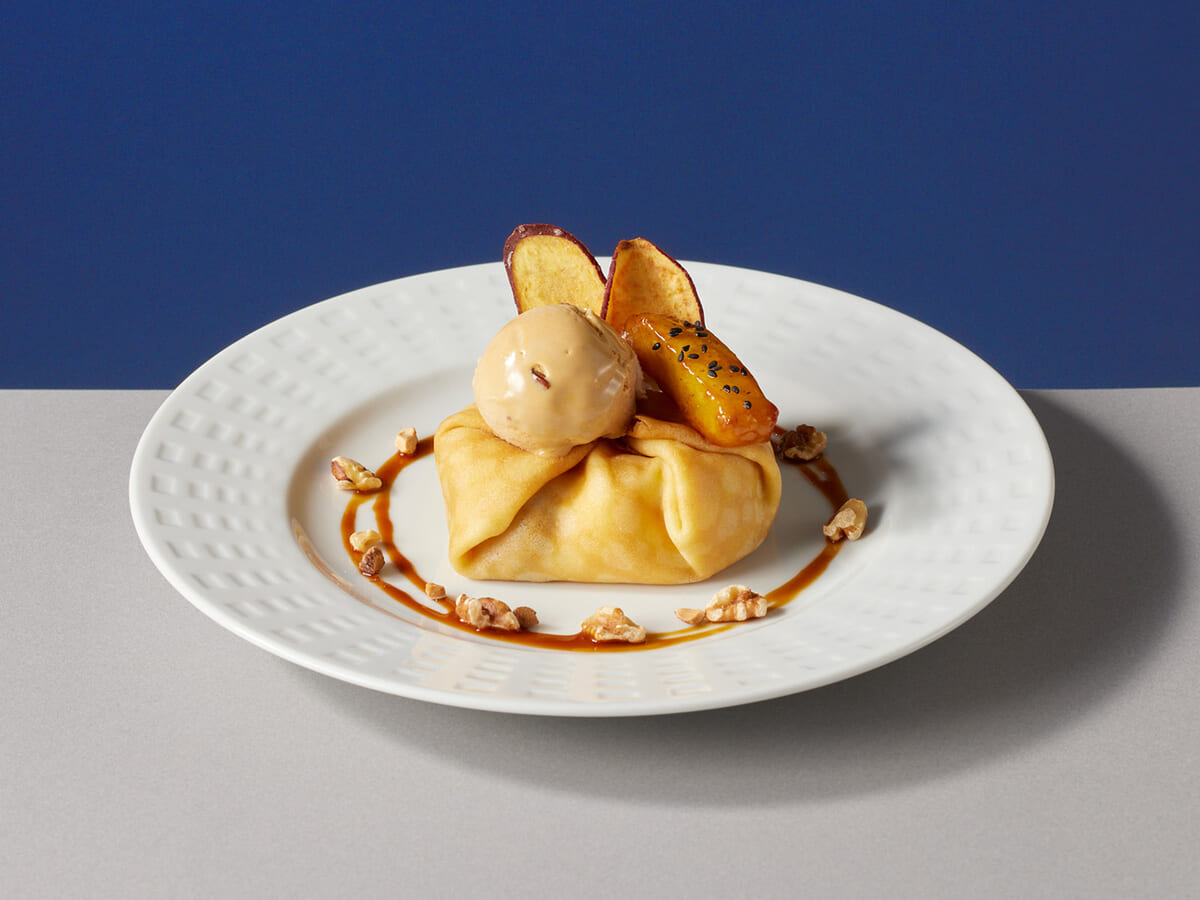 ほくほくの焼きいもと程よい酸味のりんごのコンポート、とろっと甘いカスタードをもちもちのクレープで包んだプレートメニュー。