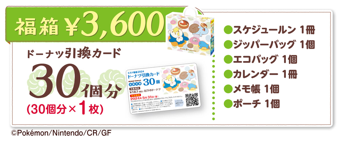 お手頃価格の「ミスド福袋2,400円」は、20個分のドーナツ引換カードと4種類のポケモングッズが入っています☆