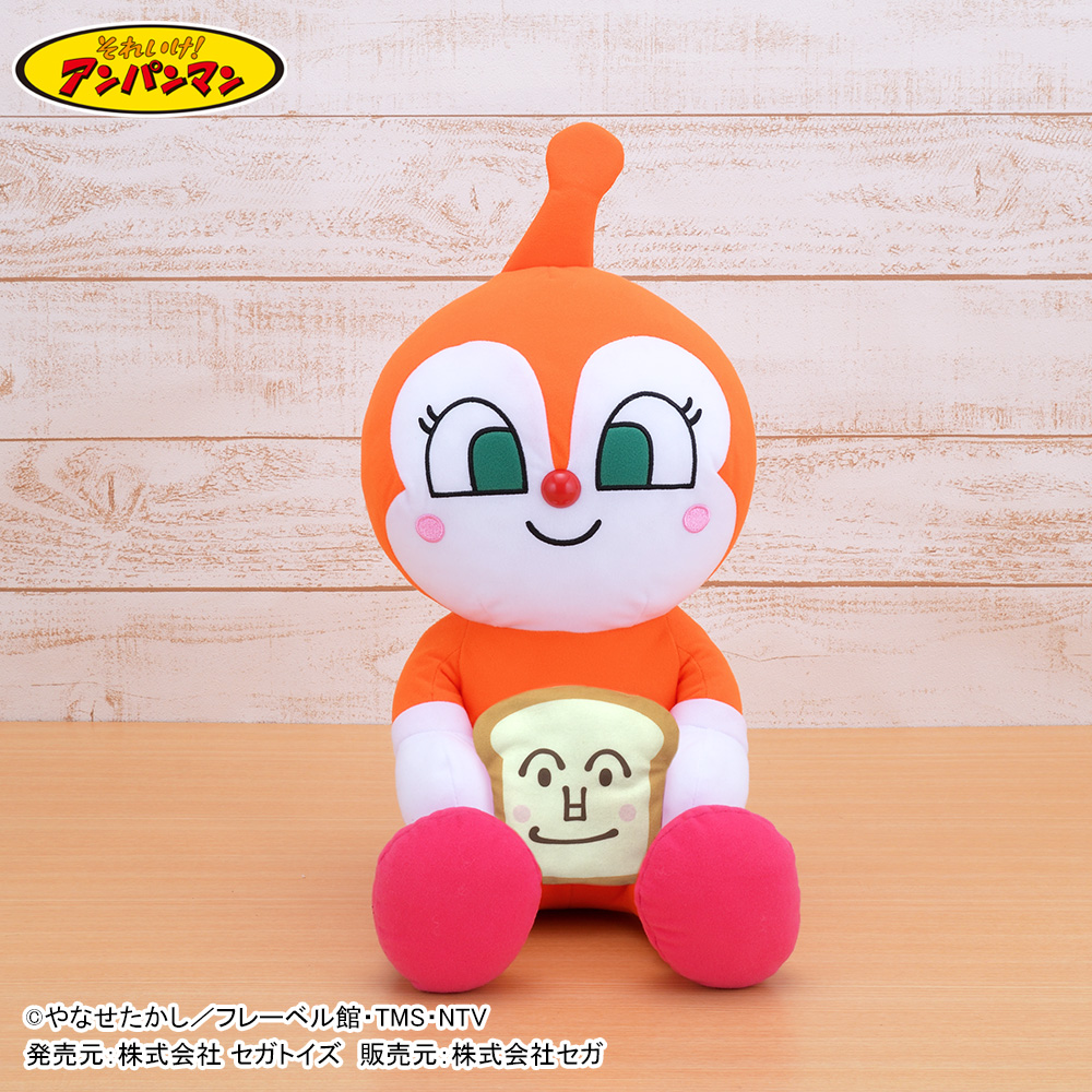 「ドキンちゃん」が「しょくぱんまん」のパン型の小物入れを持った大きなぬいぐるみ。
