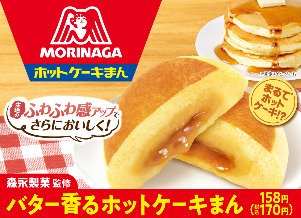 バター風味の生地で、バター風味のソースと森永製菓のケーキシロップにメープルシロップを加え、コクのあるソースが中から出てくるように仕上げられた「森永製菓監修 バター香るホットケーキまん」