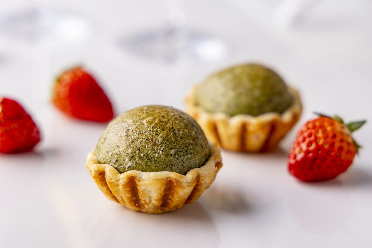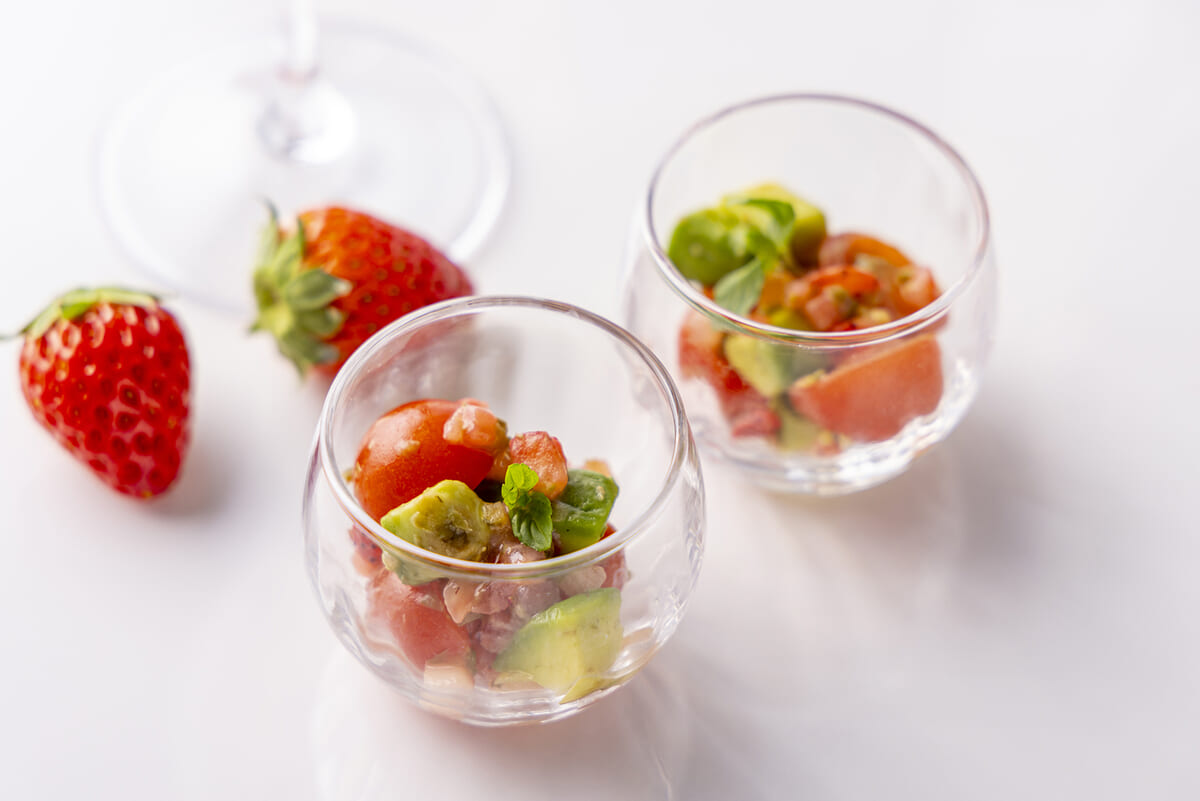 「アボカド、トマト、イチゴのタルタル」に加え、グラスで提供されるフレッシュ苺と2種類のスイーツセットも。