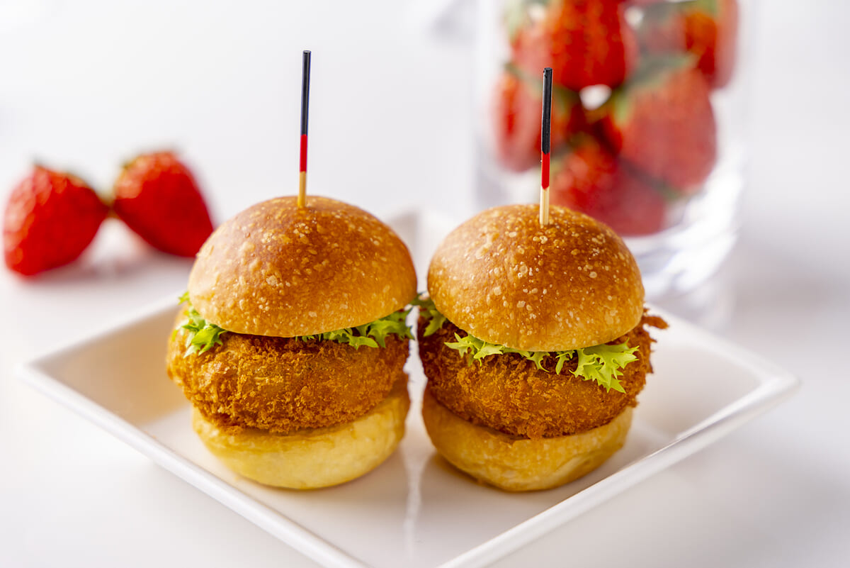 メンチカツバーガー/ビーツ入りポテトのポタージュ/アボカド、トマト、イチゴのタルタル/ポークリエットのブルスケッタ/チキンとポテトのミニキッシュ ストロベリージュレを乗せて/春菊のケークサレ/ベリーブレッドのトリュフ卵サンド/ホワイトチョコのスコーン/ストロベリーチーズガナッシュのブリオッシュ/ストロベリーピスタチオデニッシュ/洋風よもぎあんぱん/2種類のストロベリースイーツ(「マーブルラウンジ」より)/グラスフレッシュ苺(時期により産地、大きさは異なります)