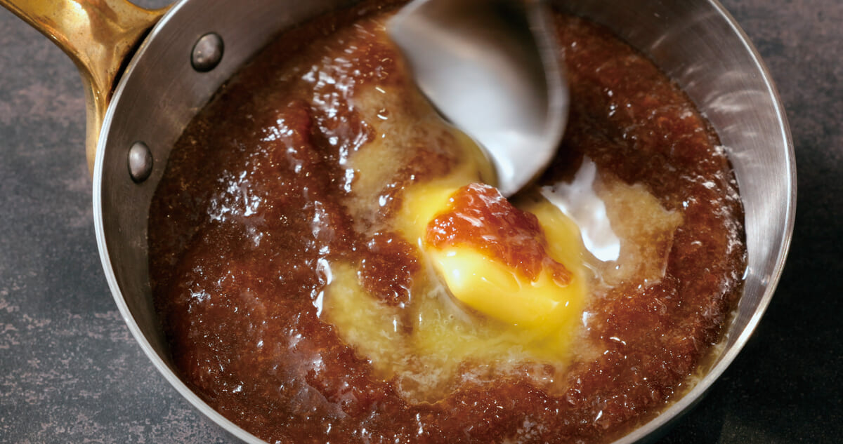 玉ねぎ・にんにく・酢・醤油を主成分とし、「低温熟成製法」で作られた熟成ソースに、提供前に店内でバターを加えひと煮立ちさせる事で、バターの芳醇な香りとコクが際立ち、まろやかな美味しさに仕上げています。