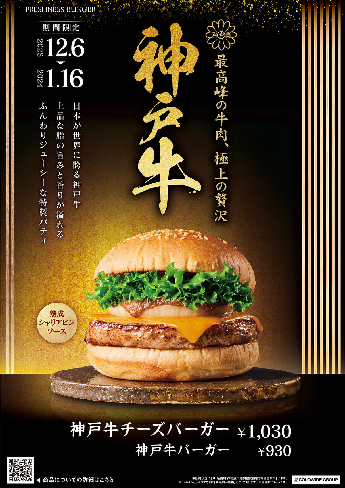 ハンバーガーチェーン「フレッシュネスバーガー」にて、冬の定番のブランド和牛バーガーシリーズから「神戸牛バーガー」「神戸牛チーズバーガー」が登場!