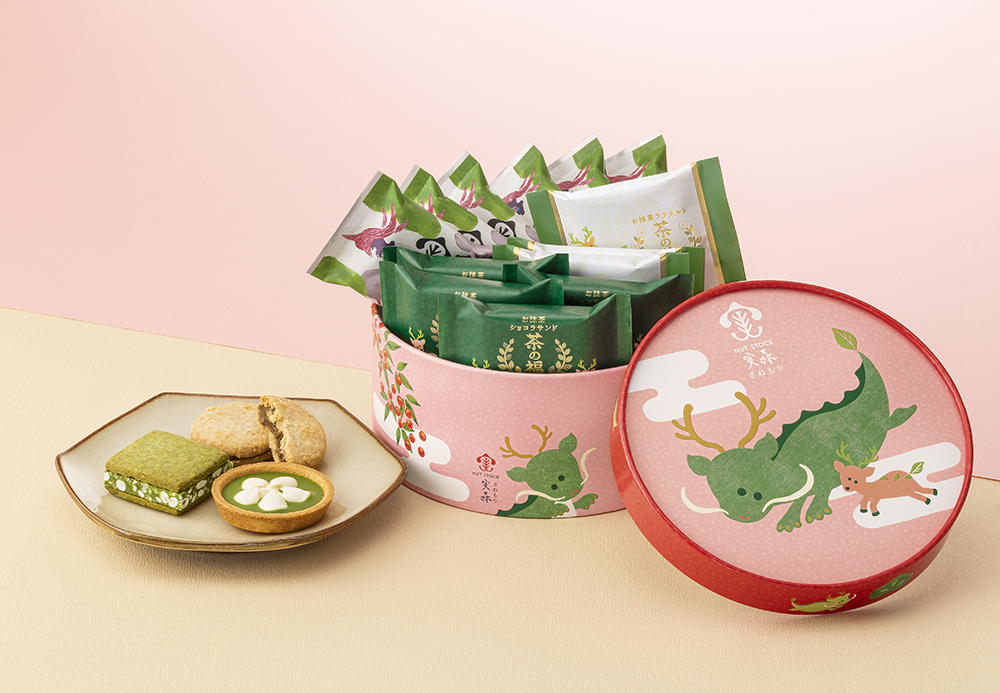 実りの森に舞い降りた“たつ”や実森のブランドシンボル“しか”が描かれた紅白カラーのボックスには、森の恵み、茶の緑、米の恵みをスイーツに吹き込んだ和菓子をアソート。