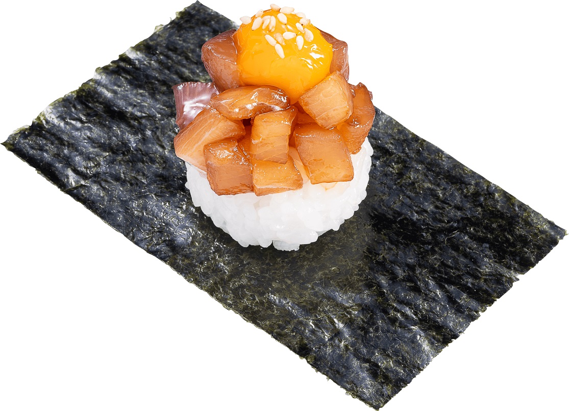 寒ぶりのぶつをオリジナルのタレに漬け、卵黄ソースといりごまを合わせた「活〆寒ぶりの漁師風包み」