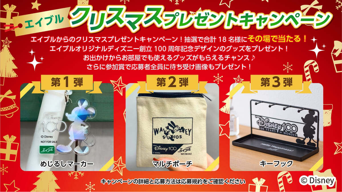 エイブルは、2023年12月1日(金)より、エイブルオリジナルディズニーデザイングッズがその場で当たる「エイブルクリスマスプレゼントキャンペーン」を開催!