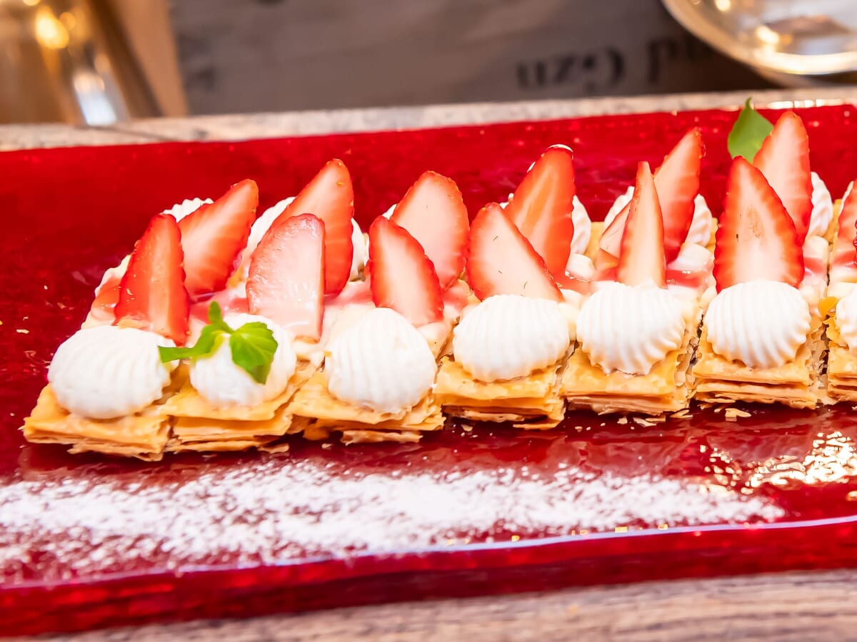 さっくりとしたパイ生地にいちごとストロベリーソースをトッピングしたスイーツ。
