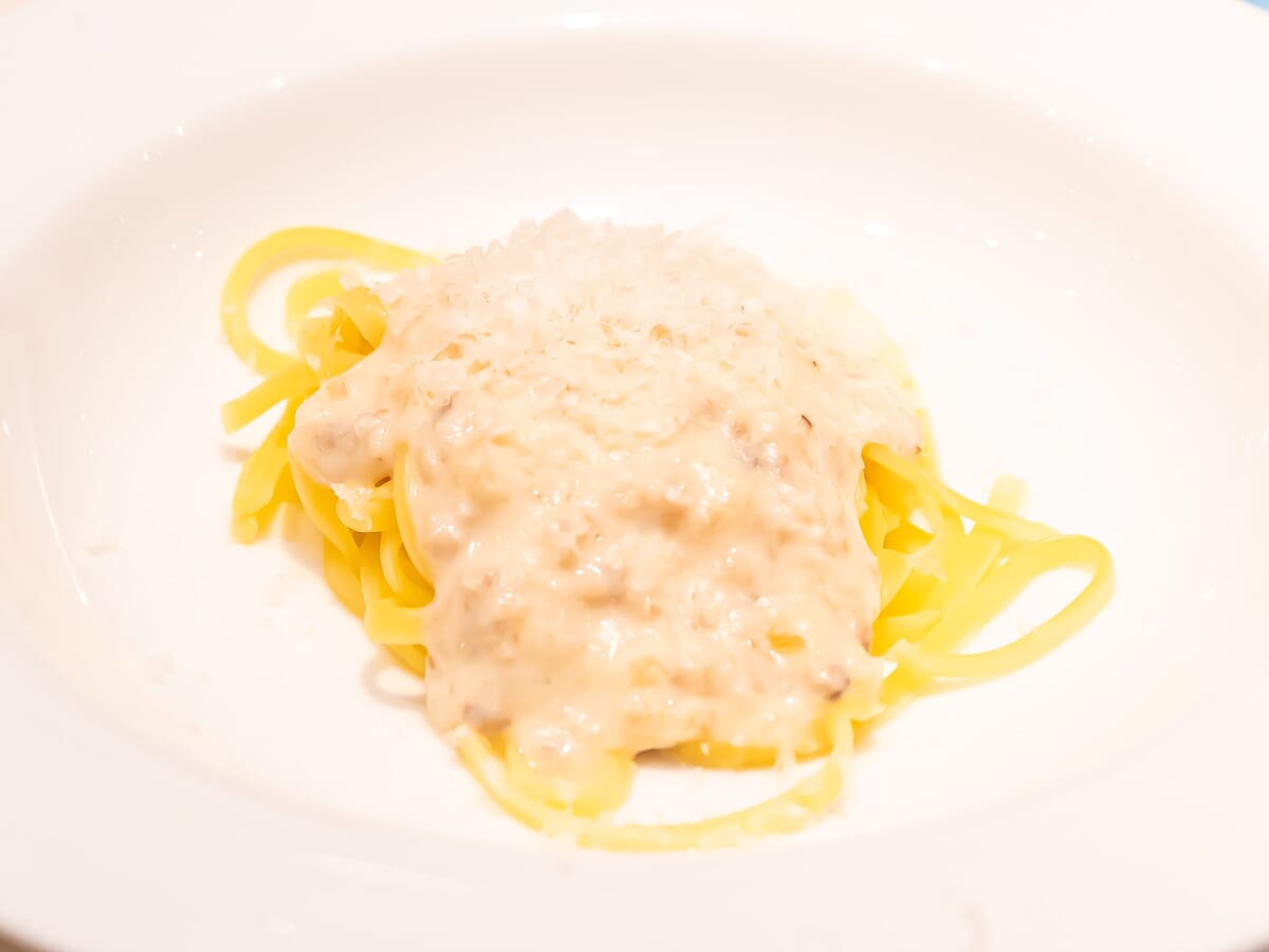 仕上げにグラナ・パダーノチーズをかけた、濃厚なチーズ味わいも楽しめるパスタです。