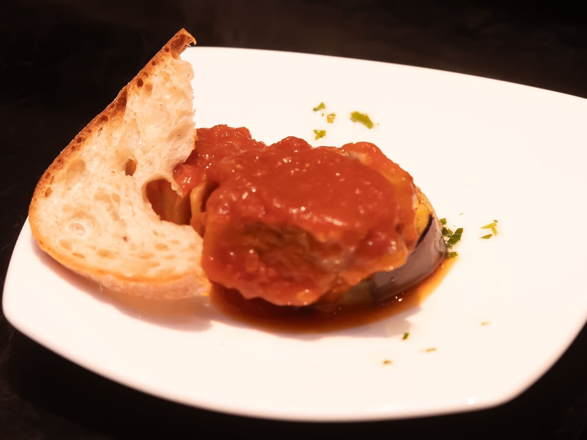 鉄板で焼いた茄子と、バゲットを添え、最後にトマトソースをかけています。