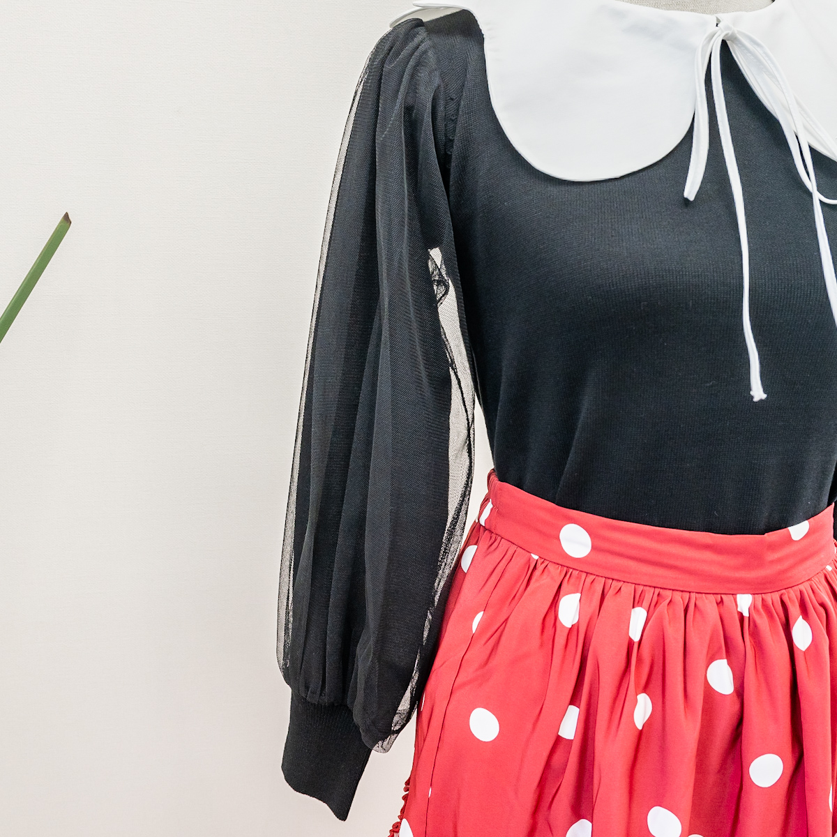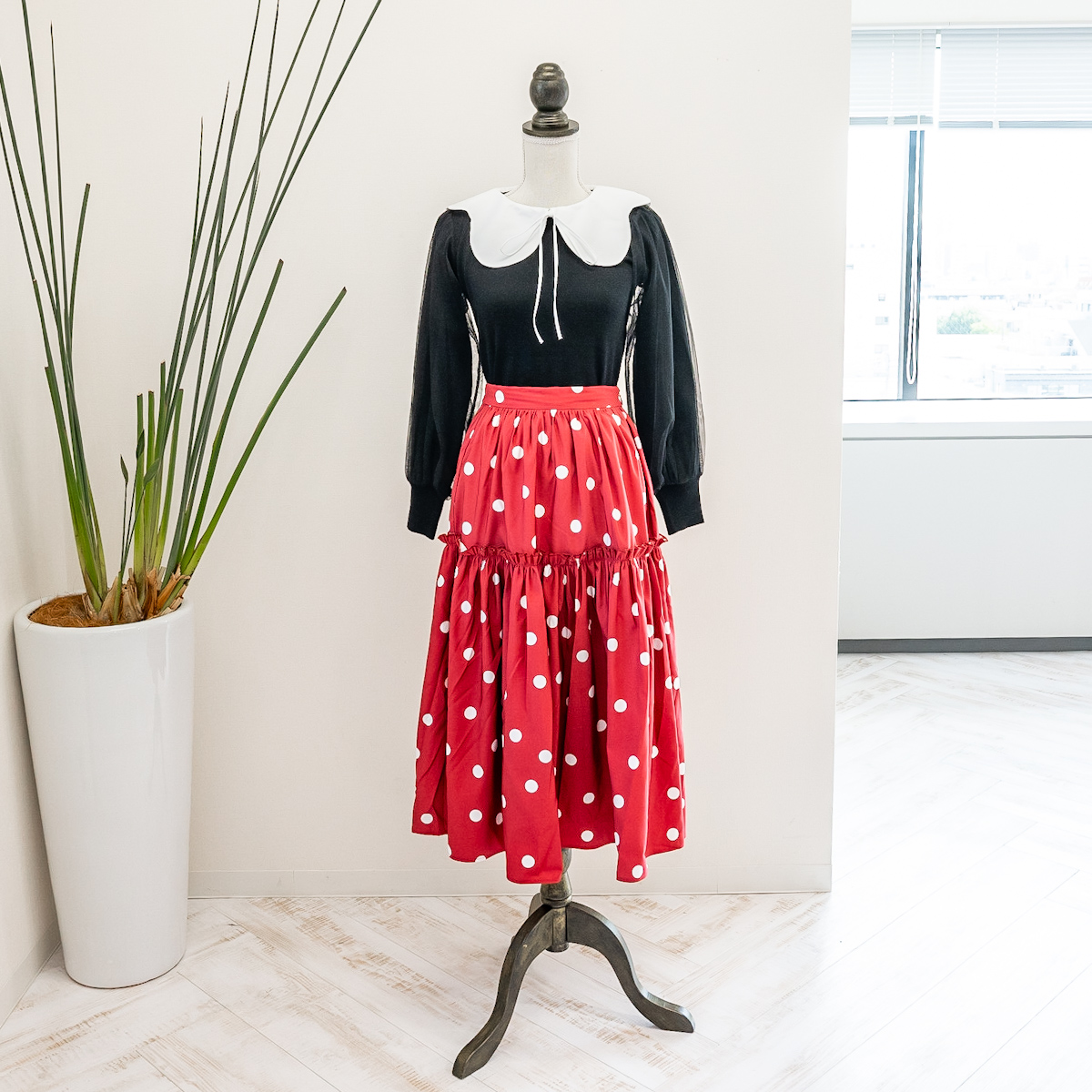 今回紹介するのは、「ミニーマウス」のトレードマーク、赤い水玉模様のスカートがかわいいコーディネート。