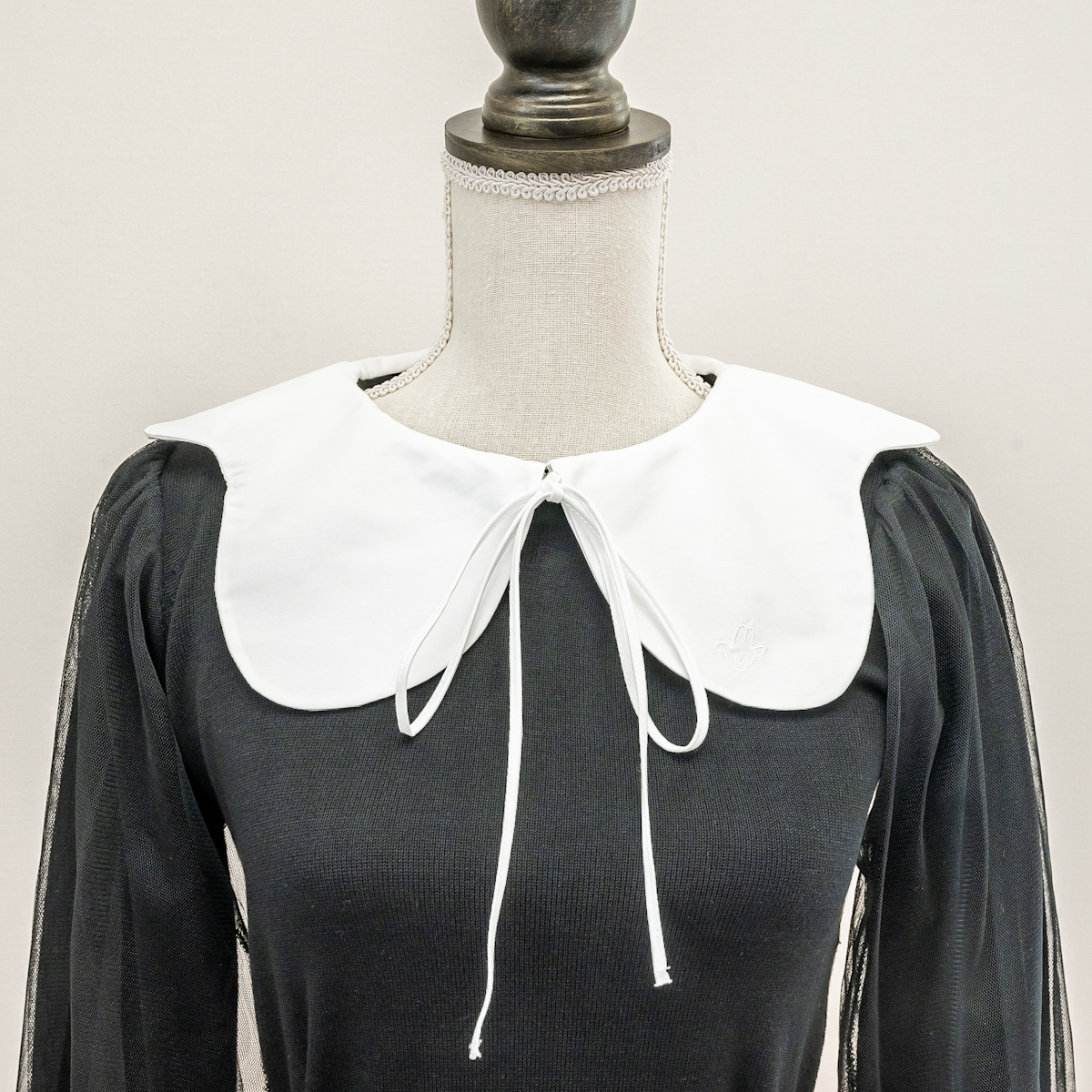 襟元はシャキッとしたイメージの「ミッキーマウス」コーデに対して、ふんわりと曲線的なデザインになっています。
