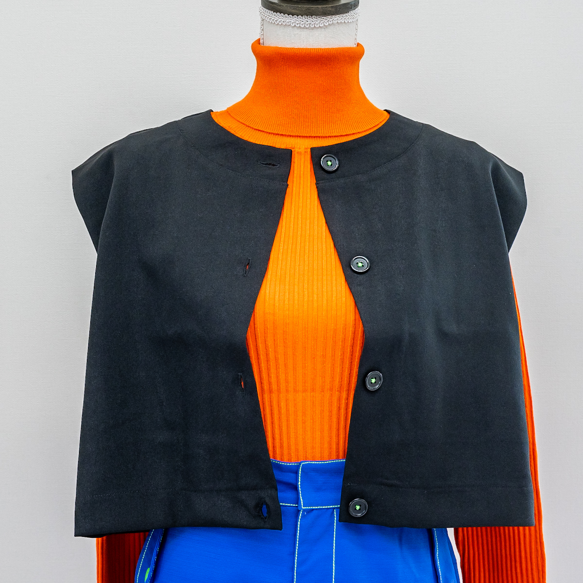 トレードマークのベストはコンパクトなサイズ感に仕上げることで、スタイリッシュな印象になっています。