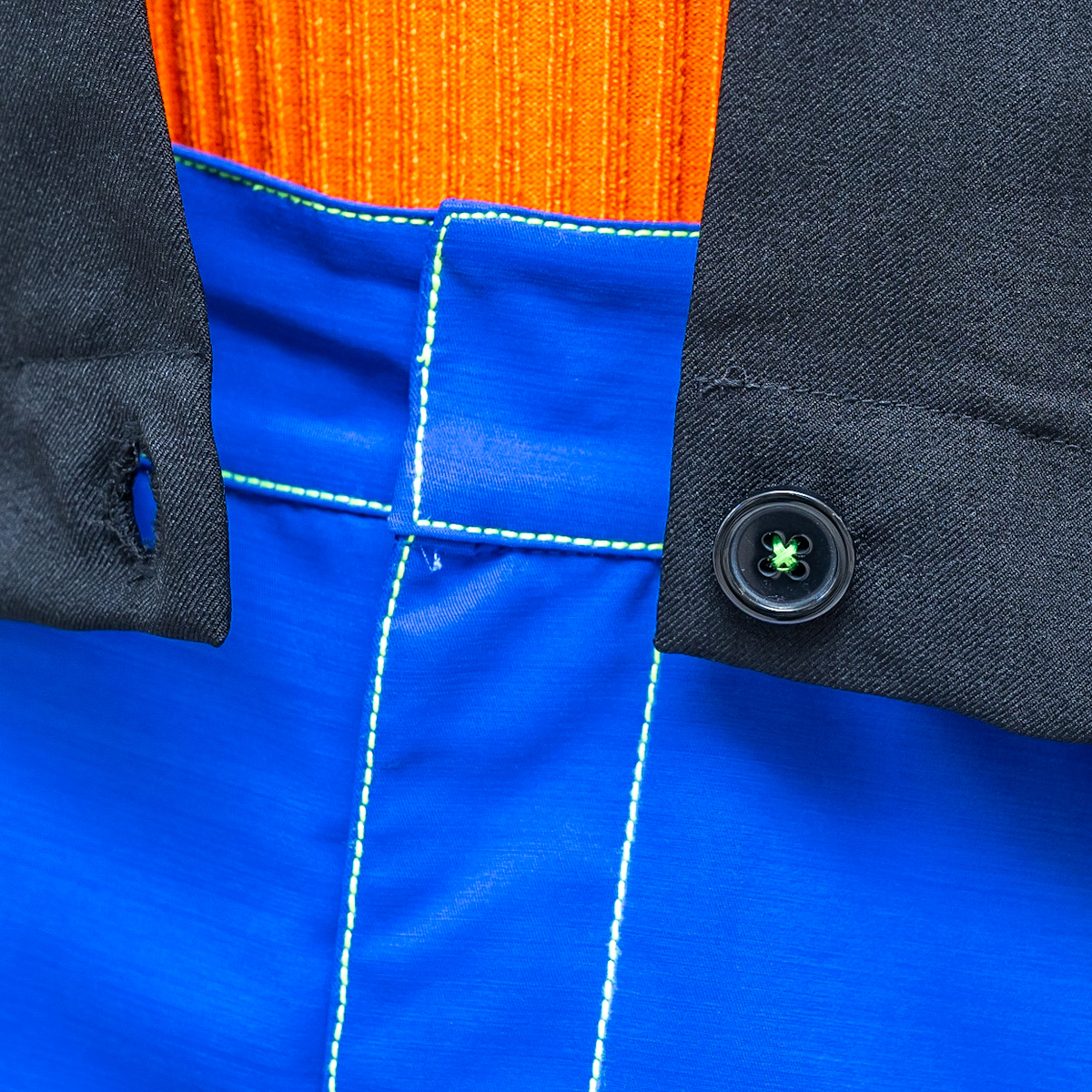 パンツのステッチやボタンに帽子のカラーを取り入れています。