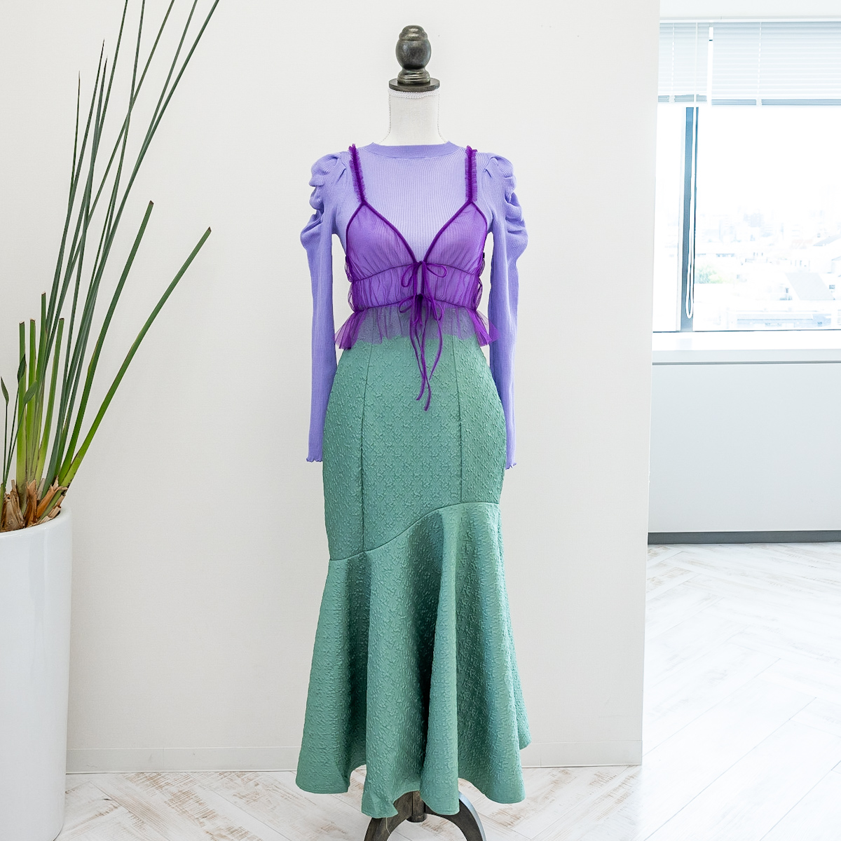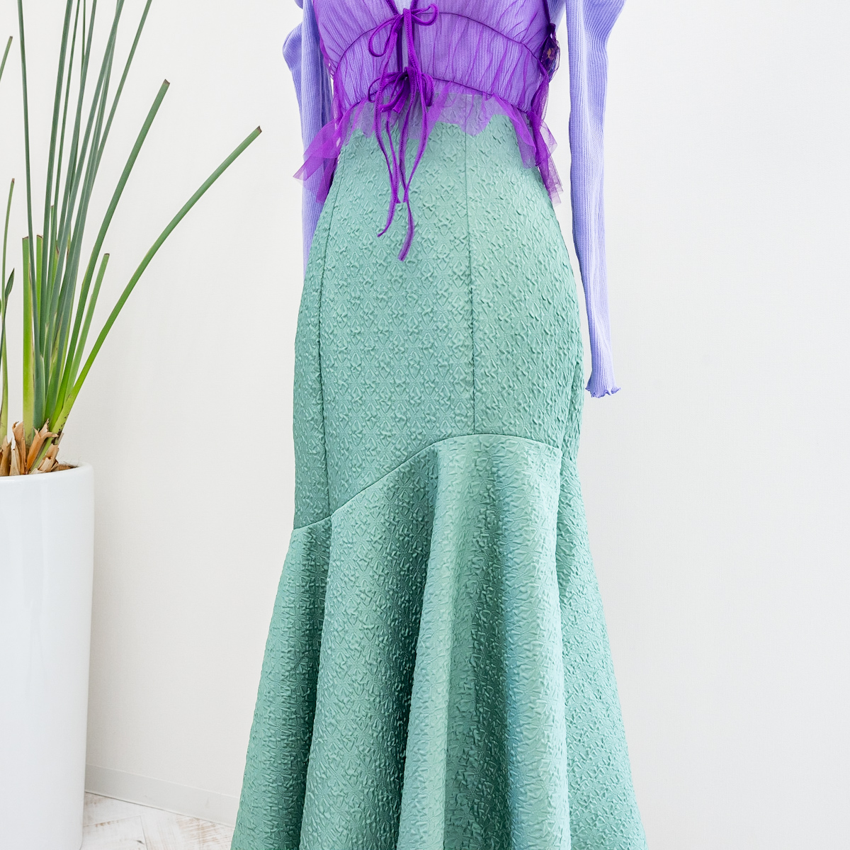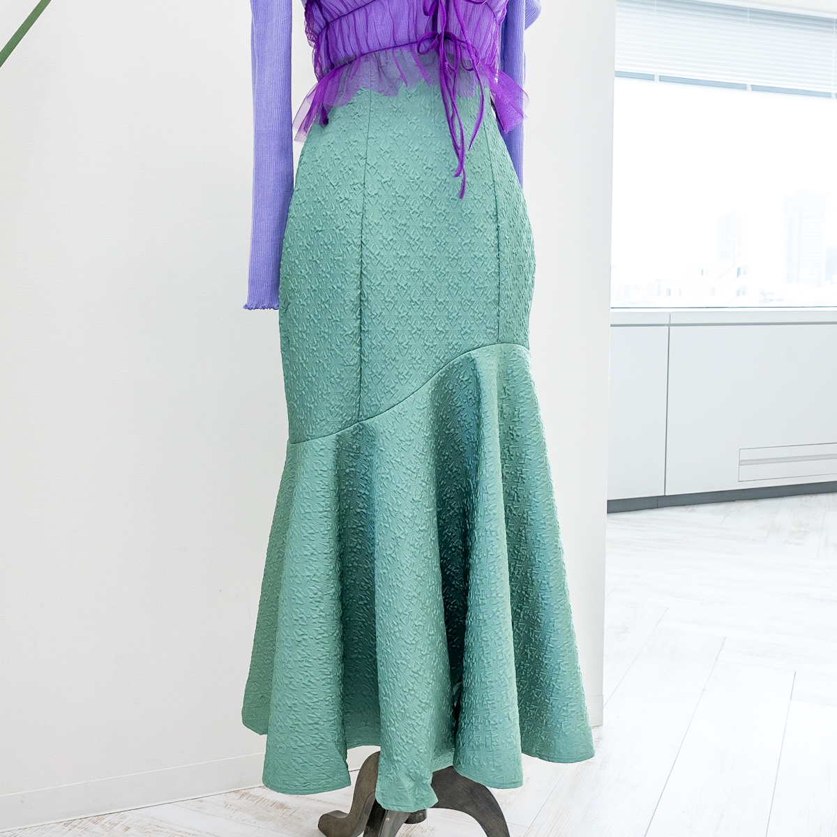 スカートは美しいシルエットが楽しめるロング丈のマーメイドスカート。