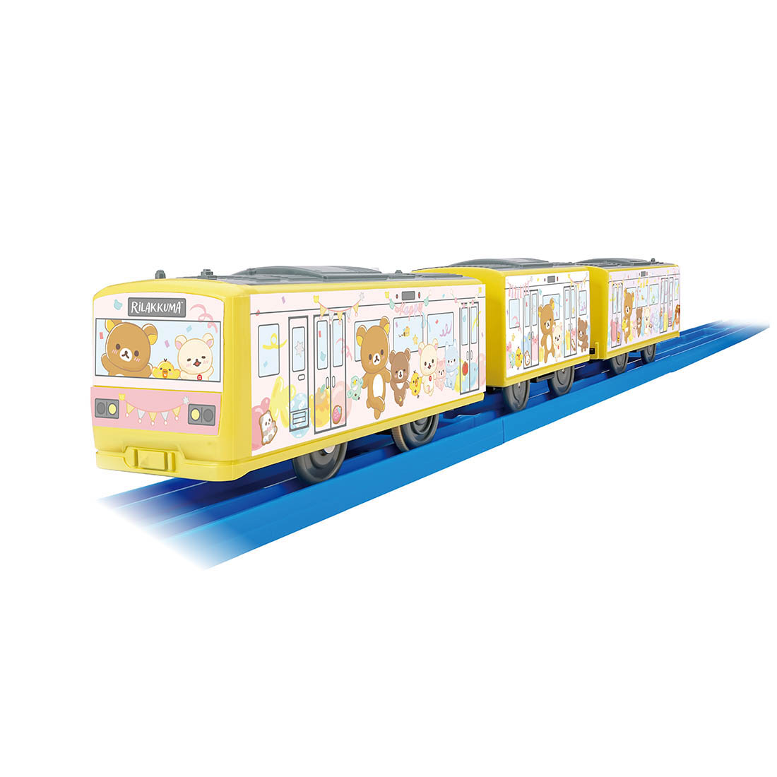 プラレールオリジナルのラッピングトレインで、車両全体に「リラックマ」や「コリラックマ」、「キイロイトリ」などのキャラクターがデザインされています。