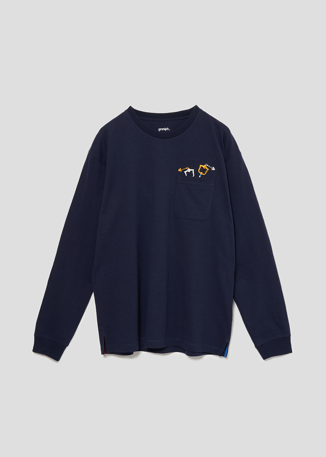 キーブレードの勇者「ソラ」が持つ光の世界の「キングダムチェーン」と、「王様」が手にしている闇の世界の「キングダムチェーン ダークサイド」がポケットに刺繍されたカットソー。