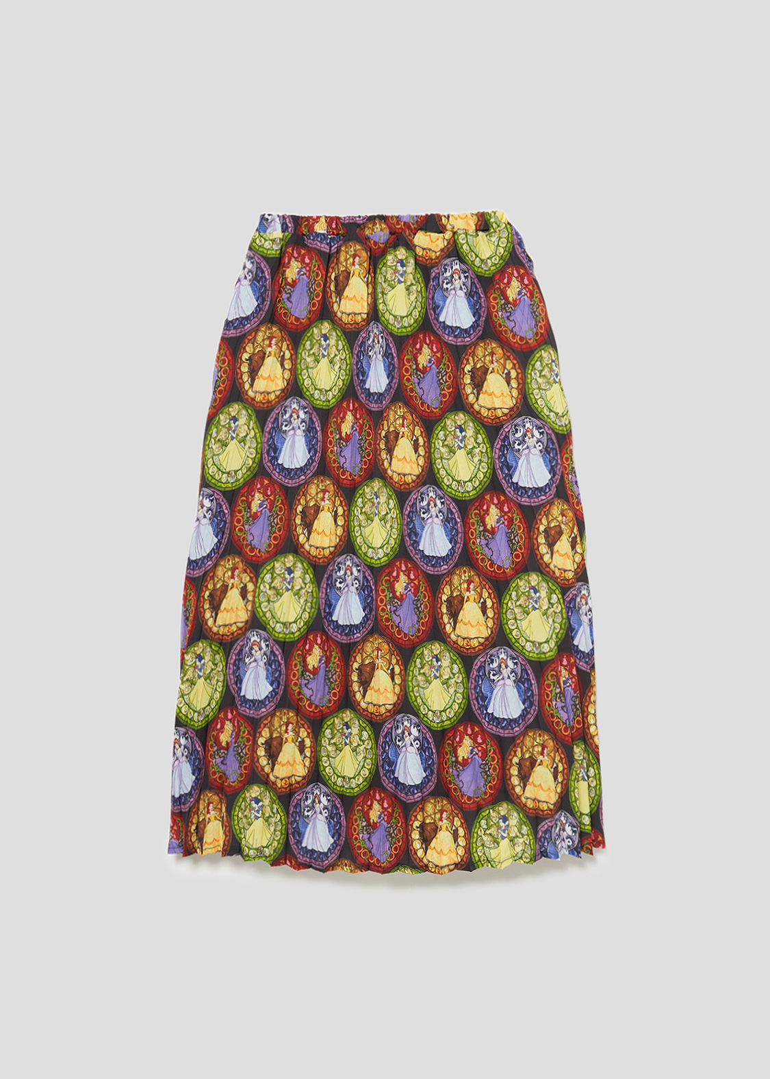 ディズニープリンセスの「白雪姫」「シンデレラ」「オーロラ姫」、「ベル」と「野獣」のステンドグラスを組み合わせた華やかなパターン柄です。