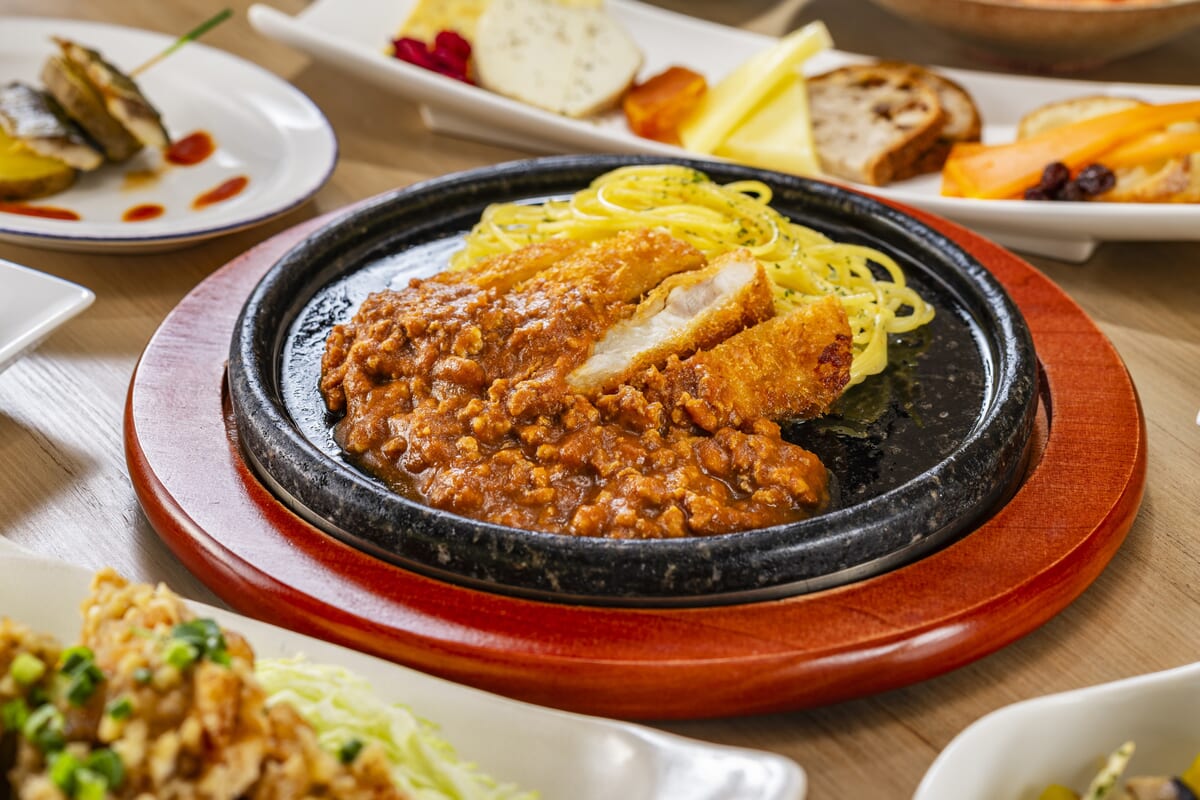 コンパス特製ミートソースパスタに“かみこみ豚”のトンカツを大胆にのせ、熱々の石焼プレートで届けてくれます!