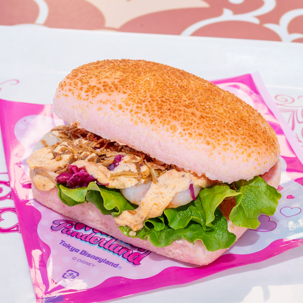 ピンク色のバンズや、キラキラしたピンク色の銀箔シュガーで「ミニーマウス」が夢に描いた世界観を表現したサンドです。