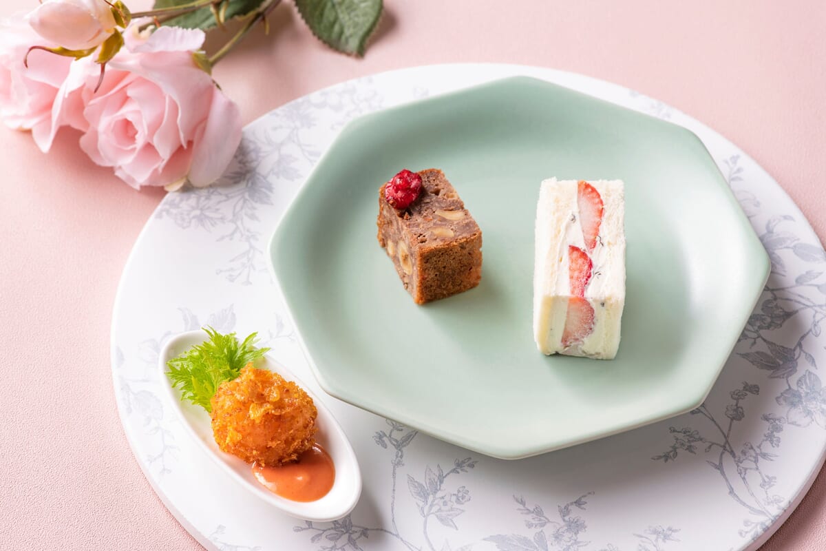 サクサク衣のシュリンプボール オーロラソース、ヘーゼルナッツとクランベリーのココアケークサレ、苺とアールグレイクリームチーズのサンドウィッチ