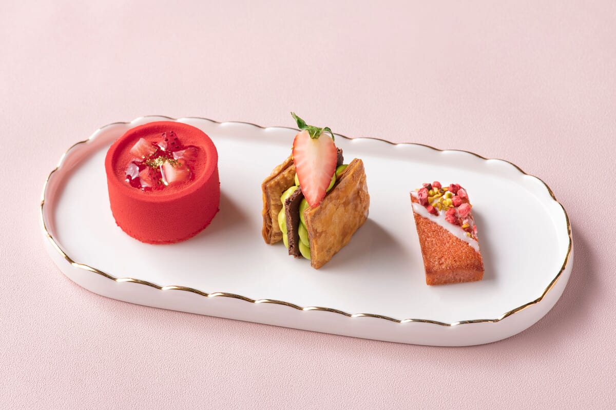 ストロベリーゼリームース、ストロベリー&ピスタチオミルフィーユ、ストロベリーフィナンシェ