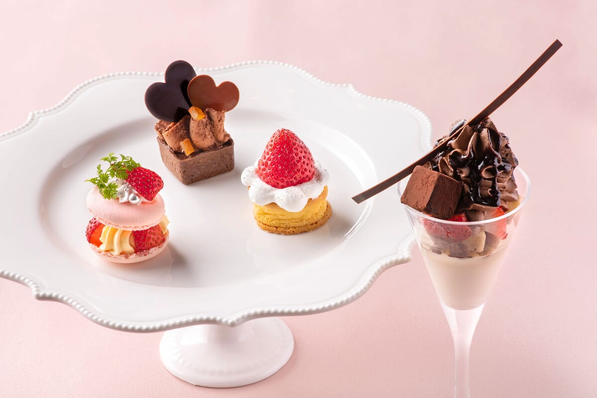 ストロベリーマカロンフレジェ/ハートチョコレートのショコラオランジュタルト/ストロベリーとモッツァレラチーズのパンケーキ/ほうじ茶とチョコレートのパフェ