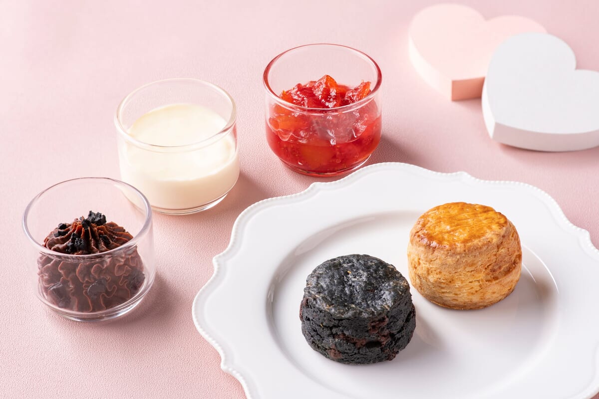 プレーンスコーン、竹炭とチョコチップのスコーン、クロテッドクリーム、苺と金柑のジャム、オリーブチョコレートクリーム
