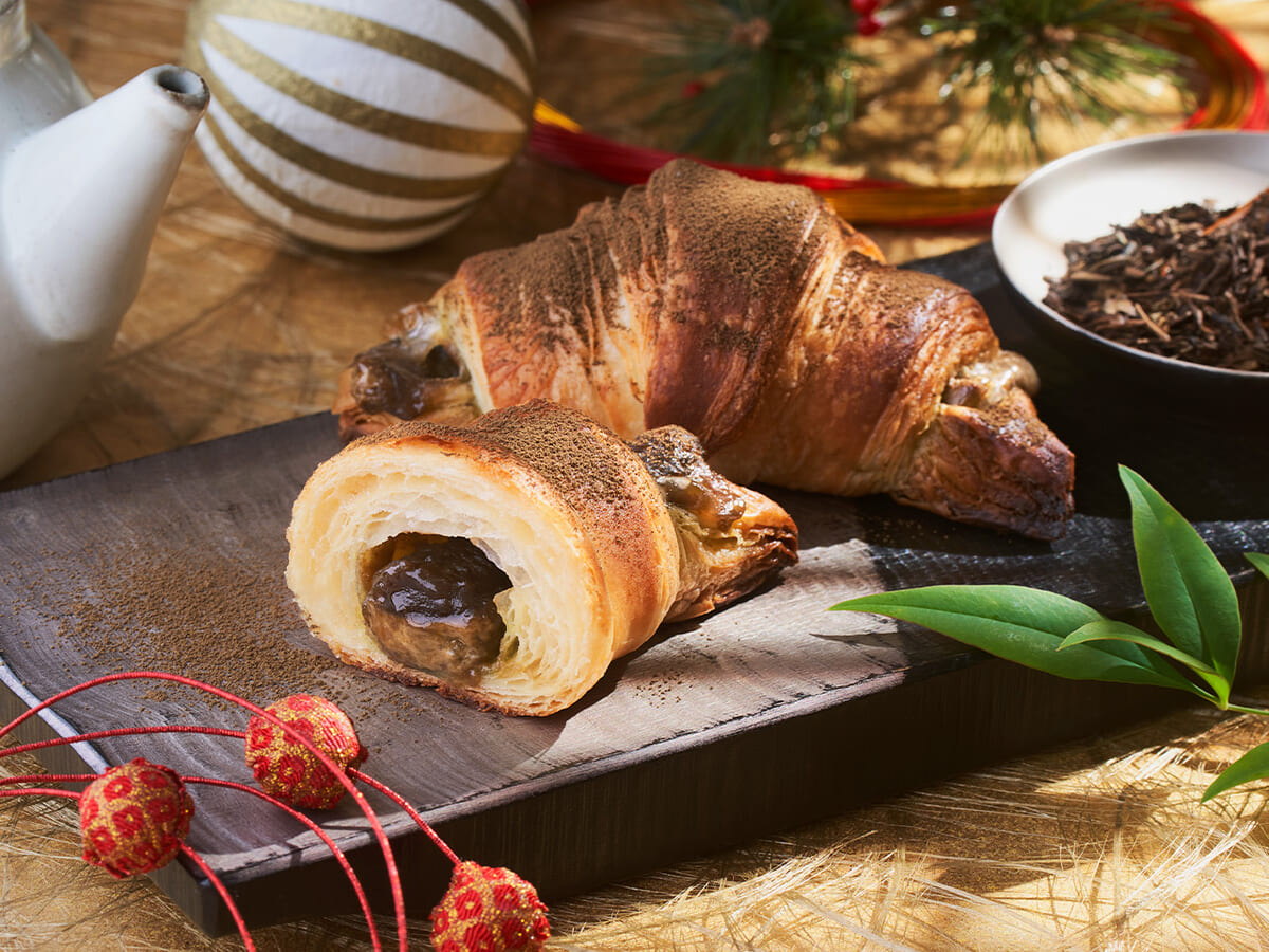 ほうじ茶をより十分に味わえるよう、仕上げに京都産のこだわり抜いたほうじ茶パウダーをかけた、お正月らしい上品で贅沢なプレミアムチョコクロ。