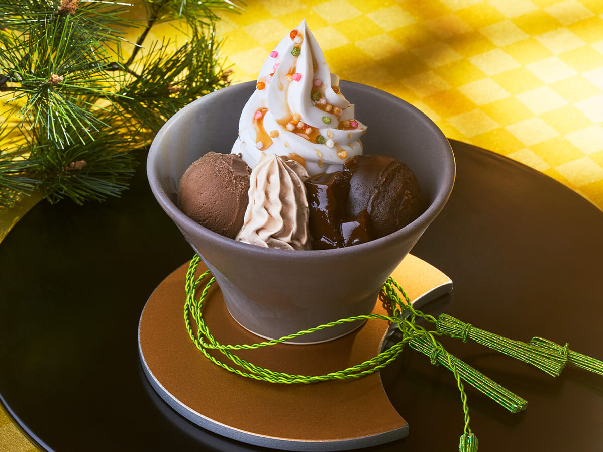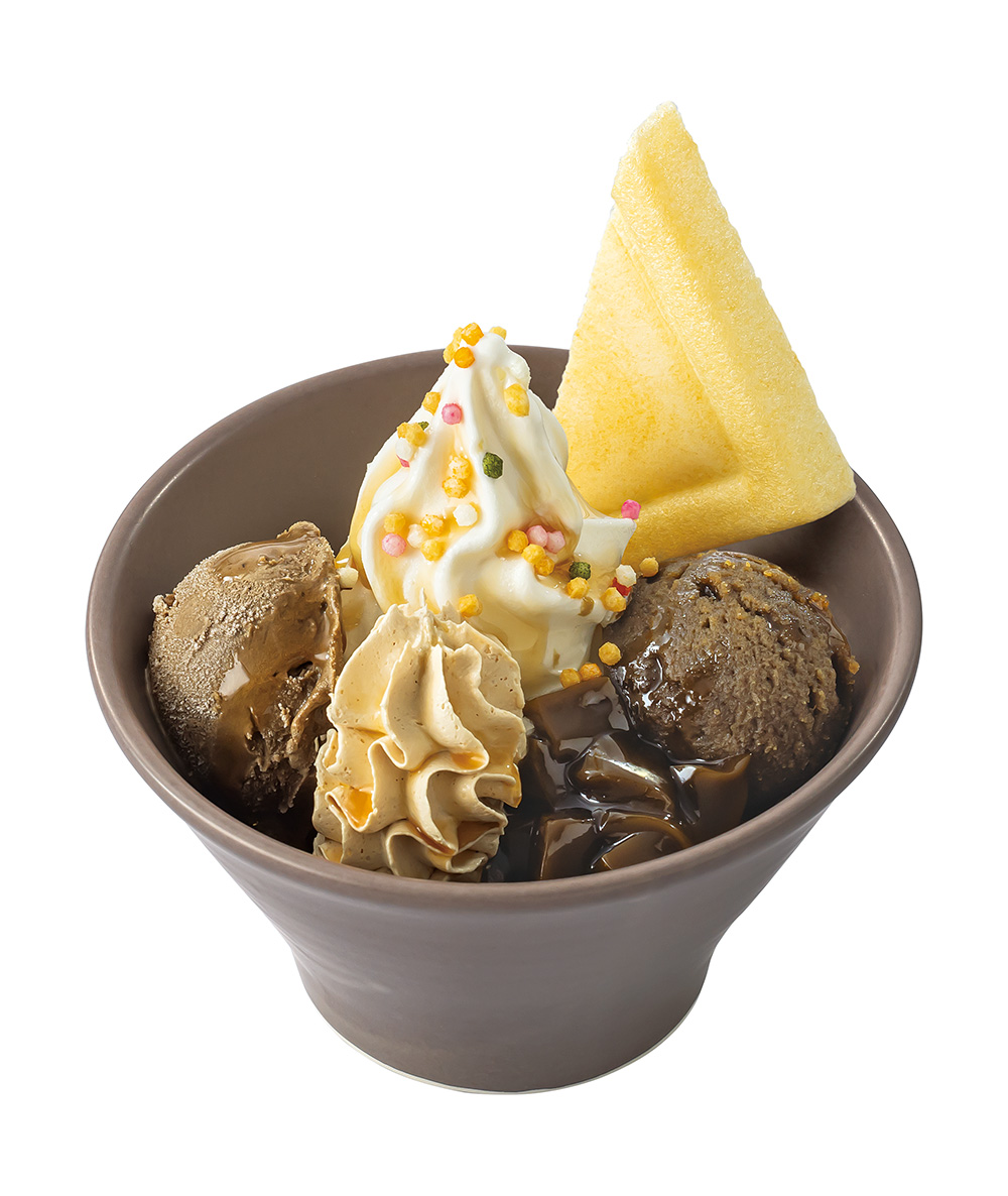 北海道産のミルクを使用した濃厚ソフトクリームに、芳醇な香りがするほうじ茶のアイスクリーム、京都産のほうじ茶を使用した濃厚なあんこをトッピングした「寿茶茶茶ほうじ茶パフェ」