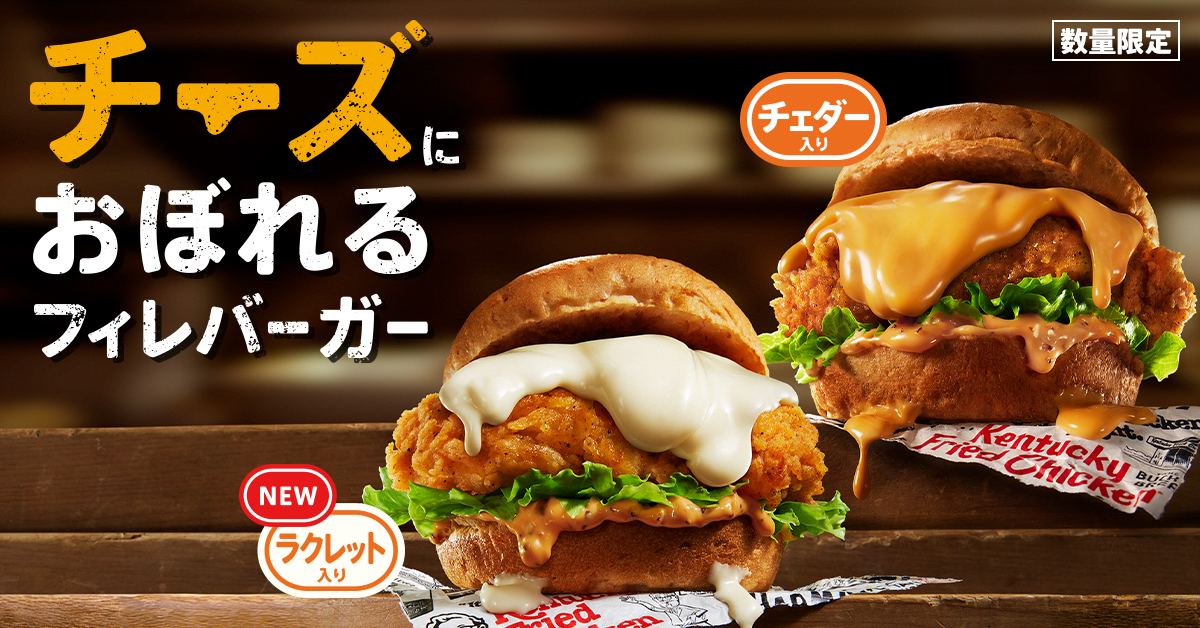 チェダーとラクレットの2種類!ケンタッキーフライドチキン「チーズにおぼれるフィレバーガー」
