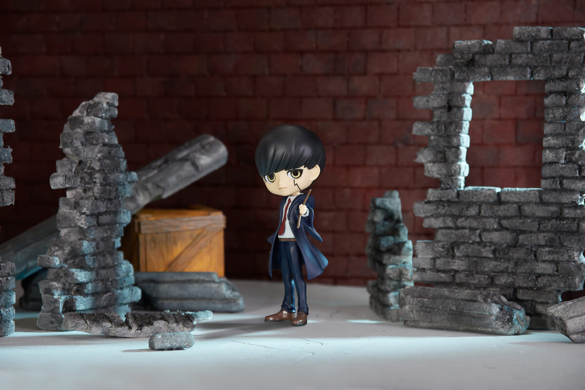 魔法がすべてを決める世界において一切の魔法が使えない「マッシュ・バーンデッド」が、魔法使いの象徴である杖を片手でへし折る様子をフィギュア化。
