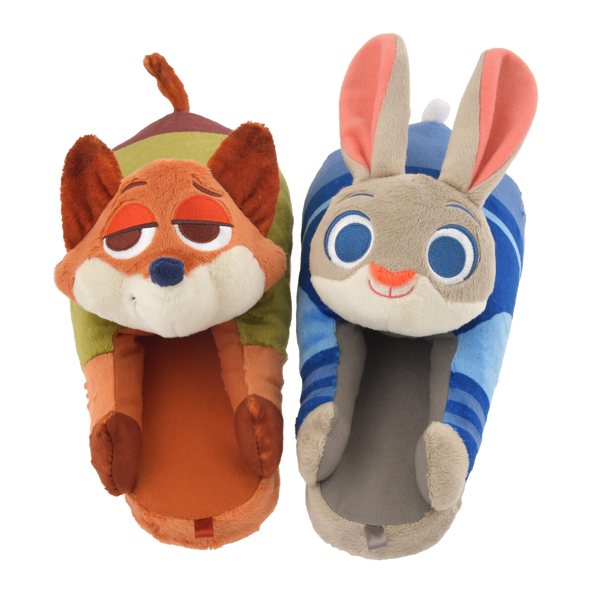 『ズートピア』のキャラクター、ニック・ワイルドとジュディ・ホップスのルームシューズは、ニックのいたずらな表情やジュディの大きな目がかわいいアシンメトリーがポイントのデザインです。