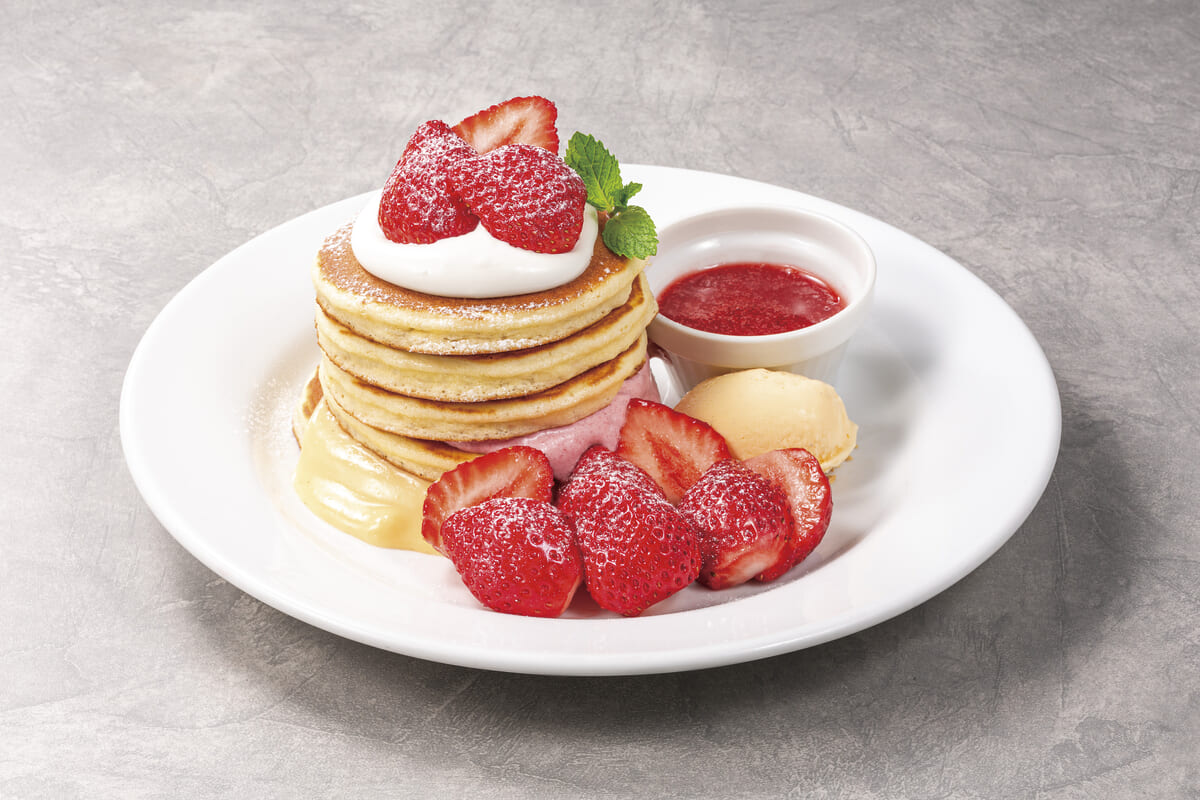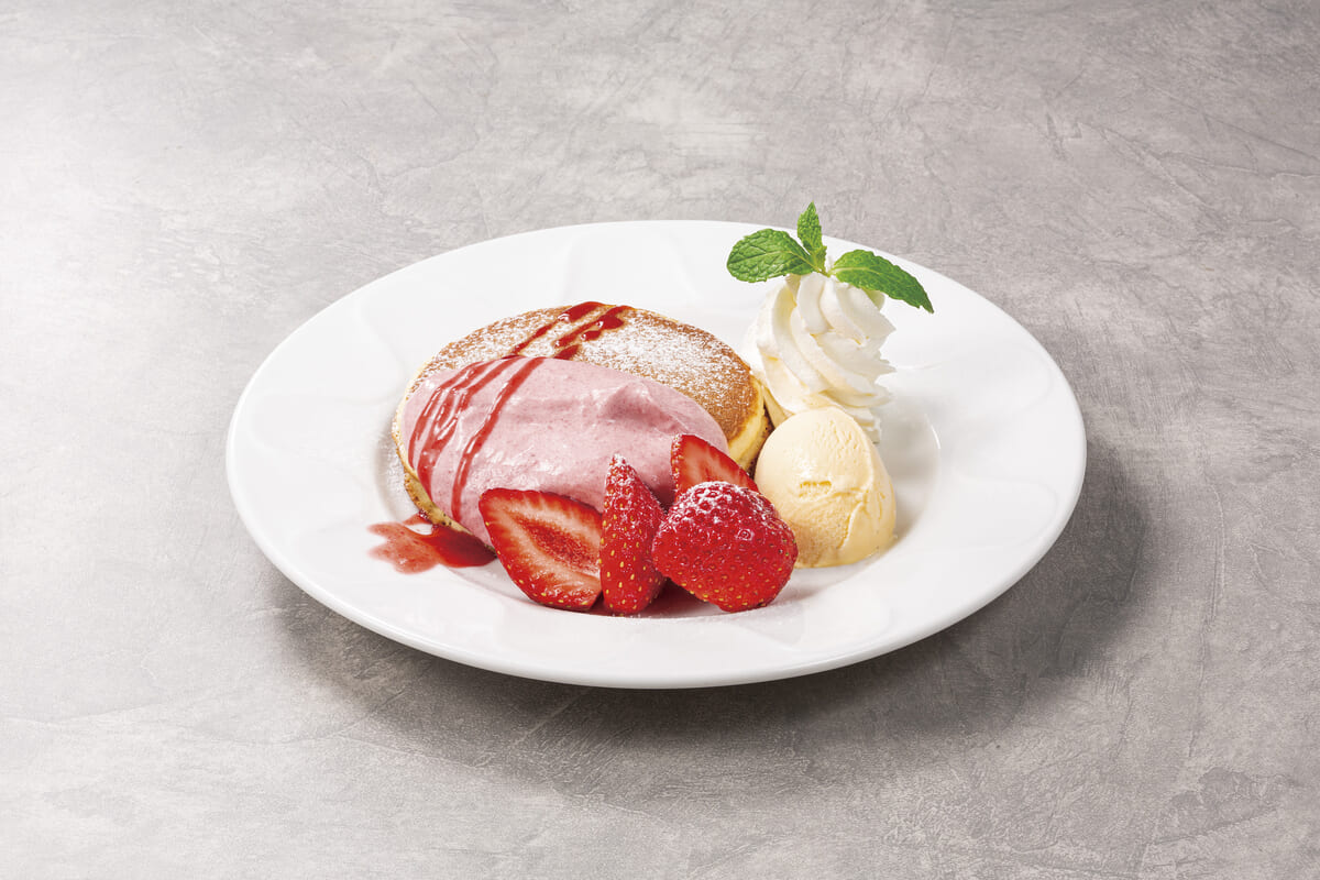 フルーティな自家製いちごソースをかけて、いちごづくしのパンケーキに仕立てたメニューです。
